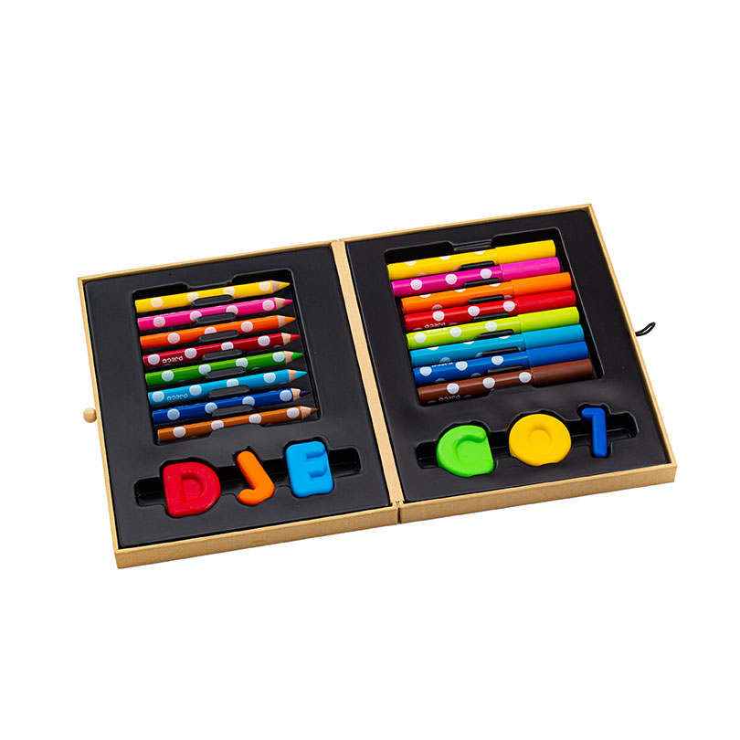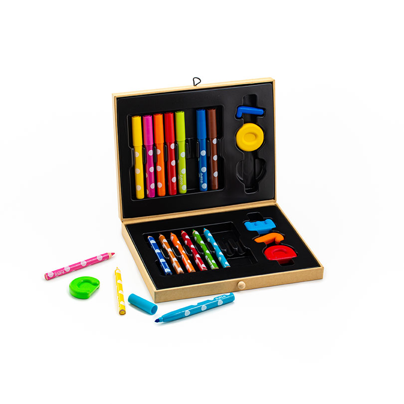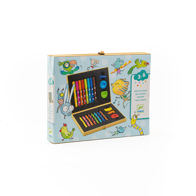 Набор для раскрашивания, специально разработанный для малышей в возрасте от 18 месяцев. В наборе есть все, что может понадобиться маленькому художнику: 8 цветных карандашей, которые удобно держать в руке, 8 моющихся плотных фломастеров и 6 восковых мелков различной формы. Вы также можете раскрасить внешнюю сторону футляра, чтобы сделать его уникальным!