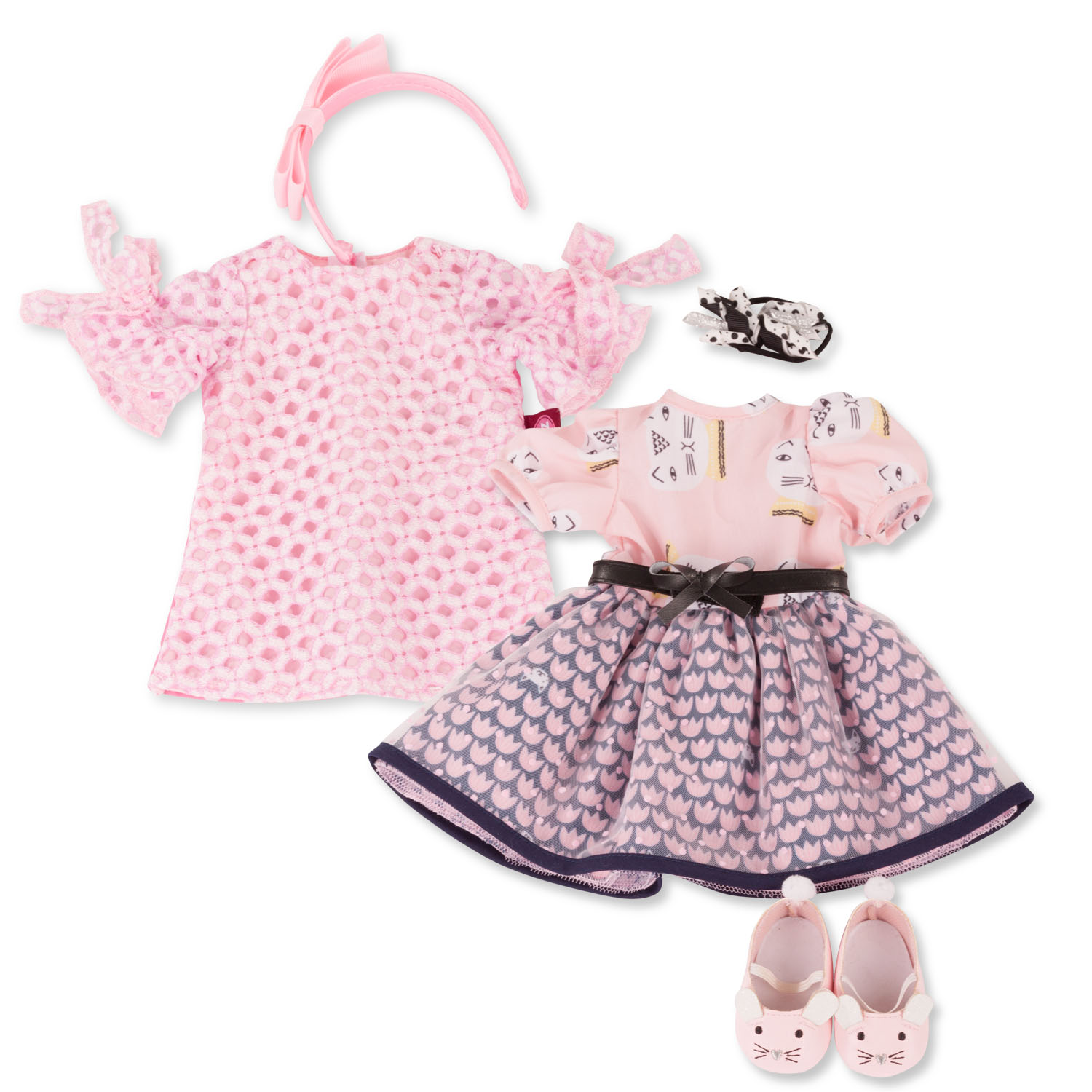 Платье с принтом кошечки и с кожаным поясом сделают вашу Gotz настоящей принцессой. Футболка с бантиками и ободок на голову идеально дополнят образ! Нежные оттенки розового будут радовать вас каждый раз!