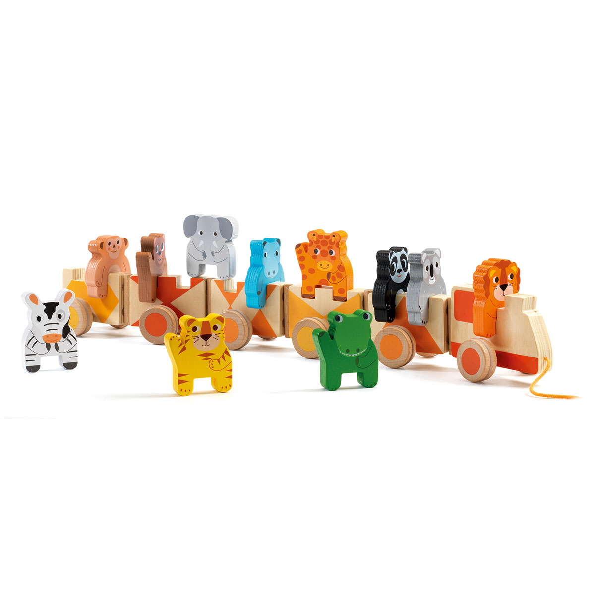Большой красочный деревянный поезд с пассажирами-животными из джунглей. Детям понравится сажать 11 животных в 6 вагонов и тянуть их за веревку. Когда животные не в поезде, они стоят вертикально, и дети могут придумывать с ними игры!