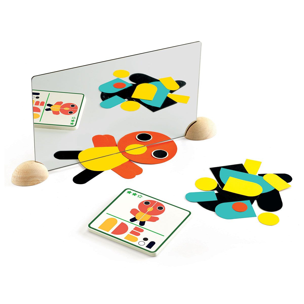 Ребенок воспроизводит различных животных, изображенных на карточках с примерами, сдвигая и накладывая бумажные фигурки под зеркалом. Ze Mirror Animals, от 6 лет.
