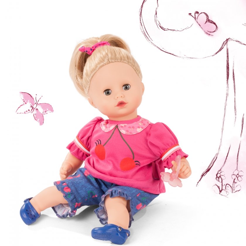 К кукле прилагается: кофта, штаны, туфли, резинки для волос, пустышка.