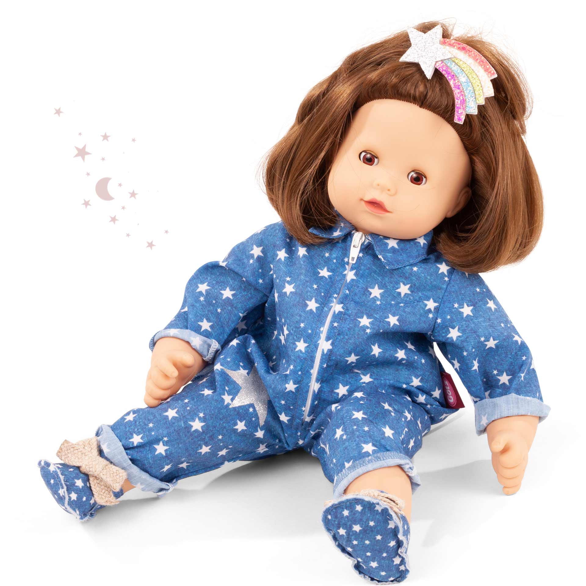 Малышка Muffin носит шикарный синий комбинезон со звездами и туфли с тем же рисунком. Модная стрижка аккуратно уложена с помощью красивой и сверкающей радужной заколки. Muffin – большая модница: ей прекрасно подойдут другие аксессуары размера S из линейки Gӧtz.