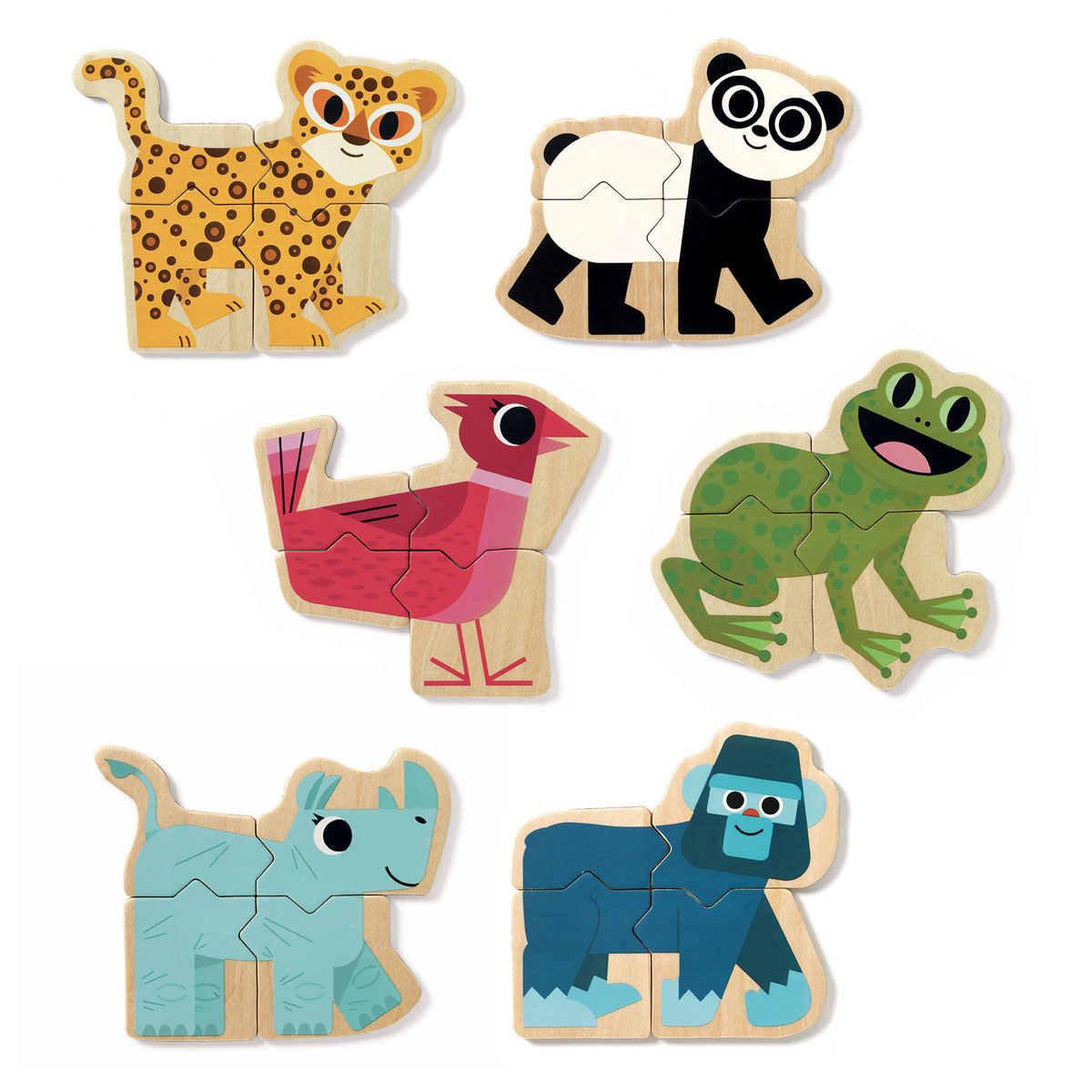 Набор из 24 магнитных деревянных деталей для детей, из которых они могут лепить обычных животных или изобретать более причудливые. Дети могут помочь горилле найти ее тело и ноги.