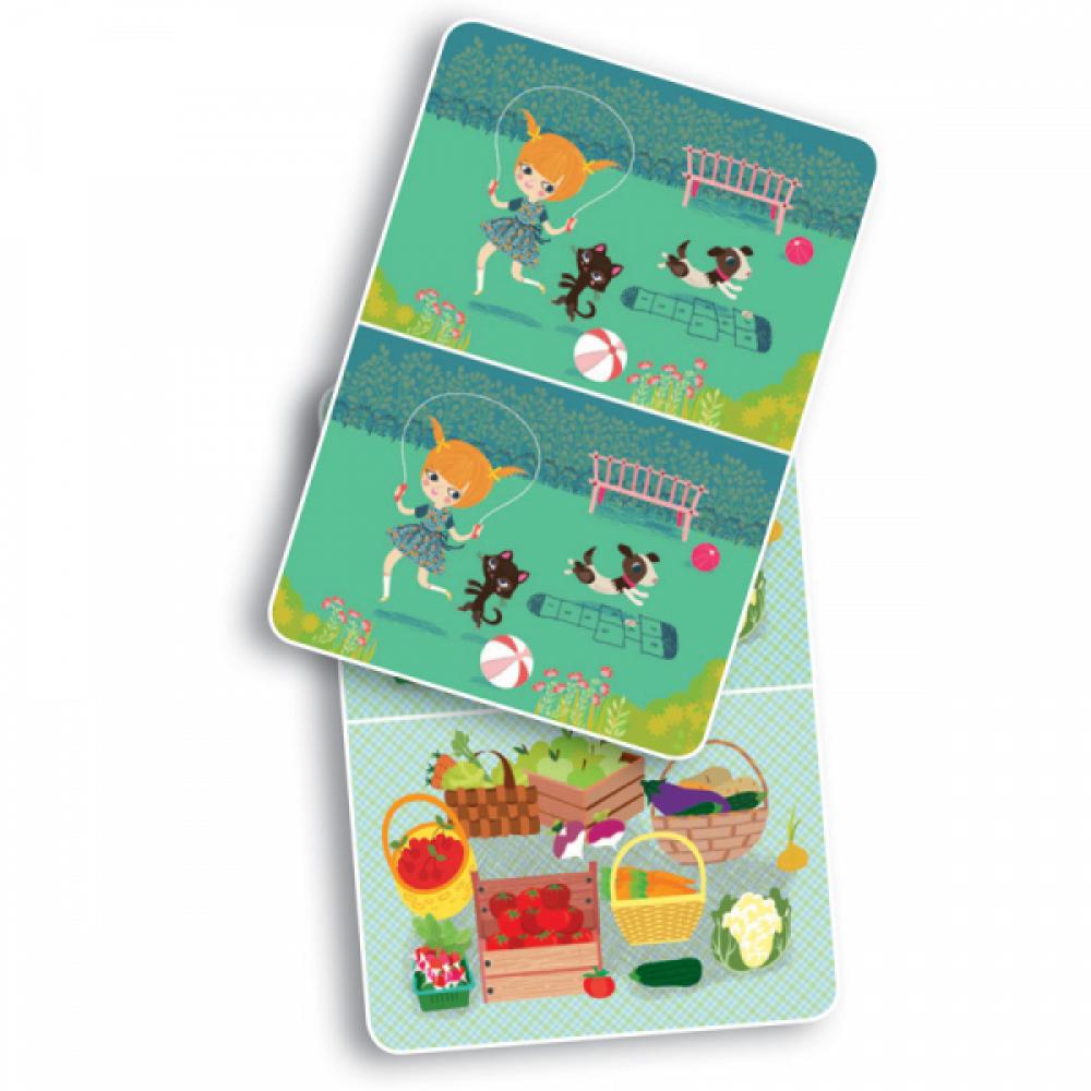 Цель классической мини-игры «Найди отличия. Леа» от французского бренда Djeco – найти между двумя картинками 7 отличий. На игровых картах изображены рисунки с разными интересными сюжетами. Игроку нужно определить, чем различаются эти, на первый взгляд, одинаковые картинки, и найти отличия.