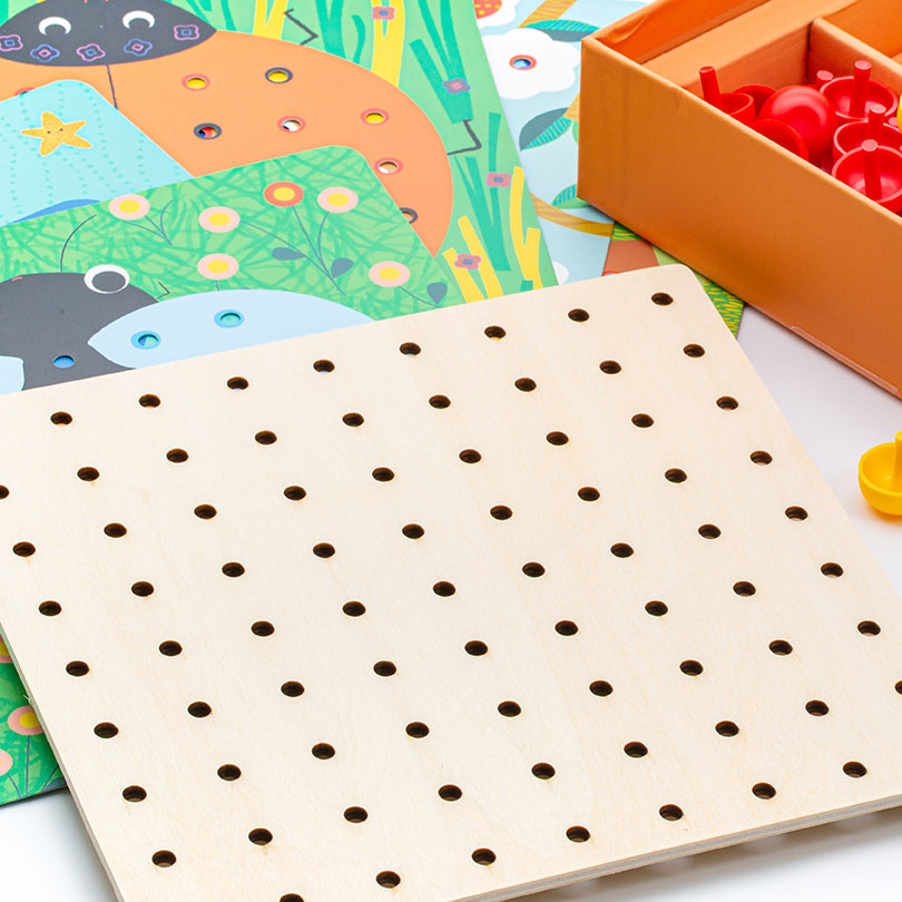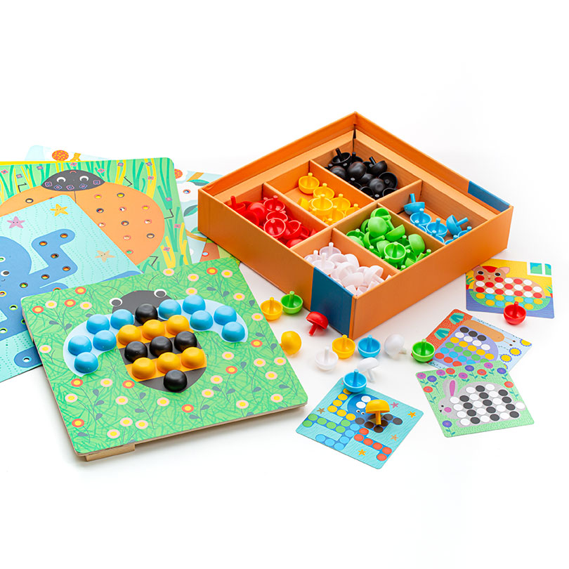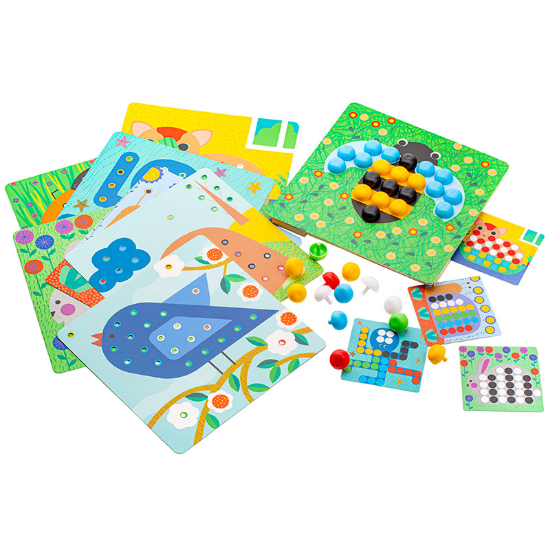 Игра "Мозаика", специально разработанная для детей в возрасте от 3 лет и старше. Создавайте замечательные картинки, выполняя 8 рисунков с помощью цветных колышков.
