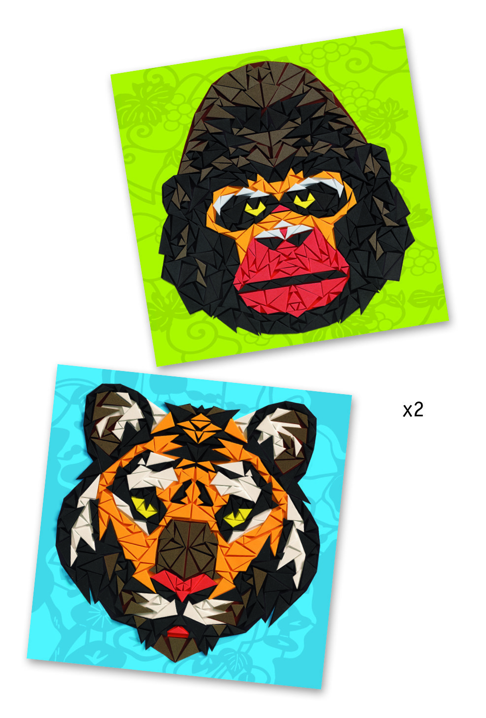 Оригинальное занятие по созданию мозаичного коллажа, в котором дети работают с треугольными деталями. Следуя пошаговым инструкциям в буклете, дети аккуратно приклеивают треугольники из пенопласта к доскам, создавая морды тигра и гориллы.