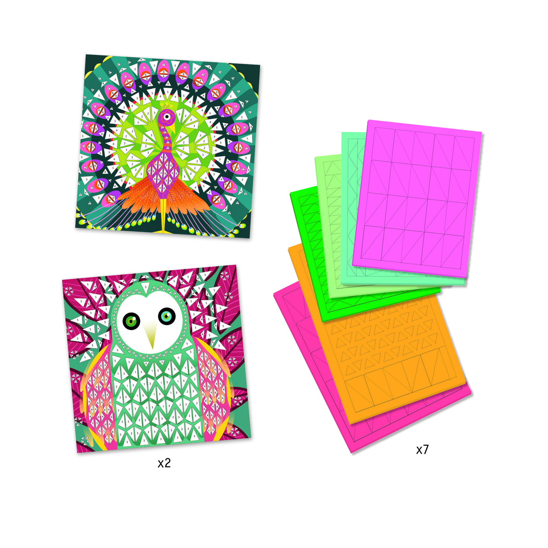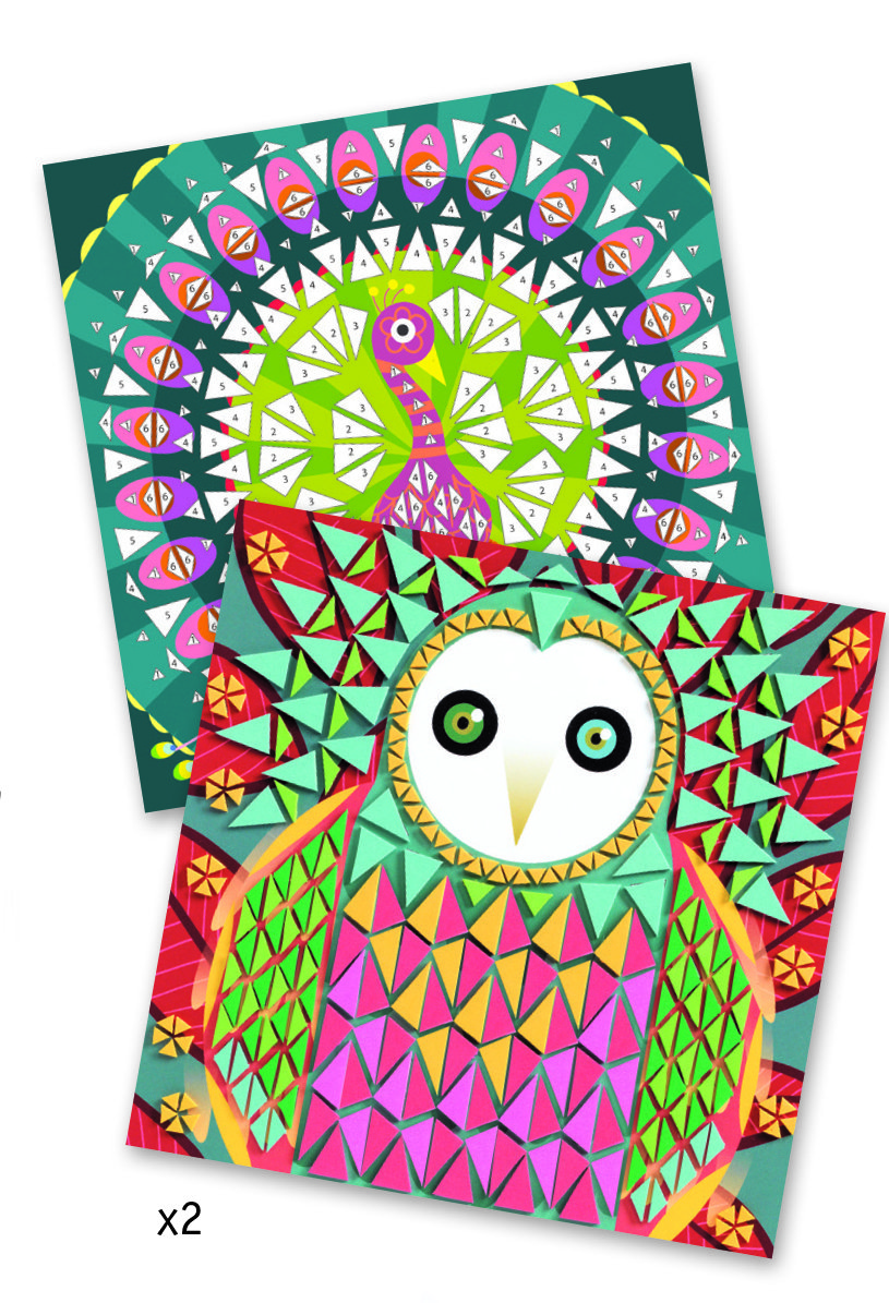 Оригинальное занятие по созданию мозаичного коллажа, в котором дети работают с треугольными элементами. Следуя пошаговым инструкциям в буклете, дети аккуратно приклеивают треугольники из пенопласта к доскам, чтобы создать оперение павлина и совы.