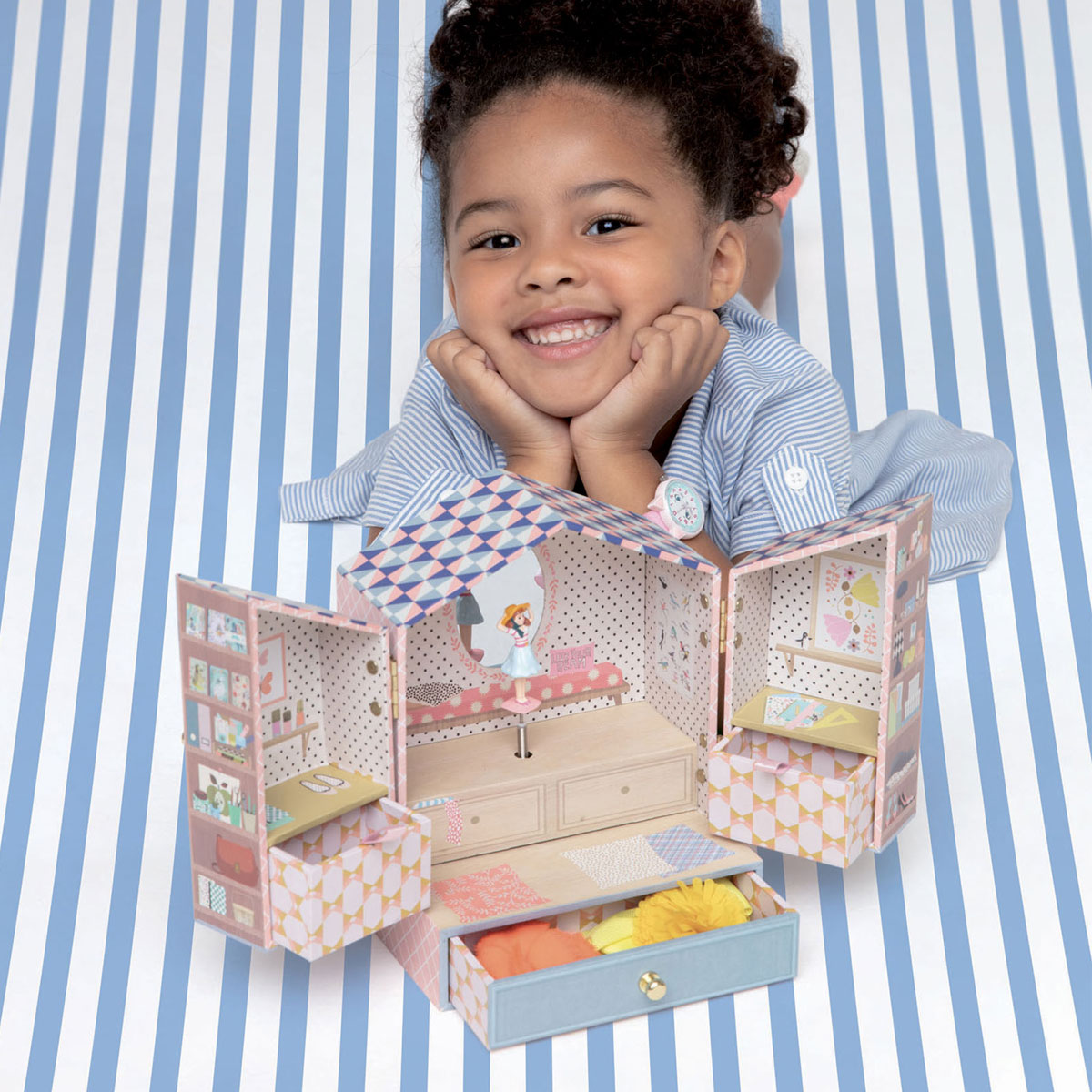 Tinou Shop — это прекрасно иллюстрированная музыкальная шкатулка с тремя ящиками для хранения ваших драгоценностей и секретов. Поверните ручку, откройте двери этого милого магазина и удивитесь! Изящно вылепленная девушка поворачивается и отбрасывает свое отражение в фигурное зеркало под звуки музыки Вольфганга Амадея Моцарта «Волшебная флейта».