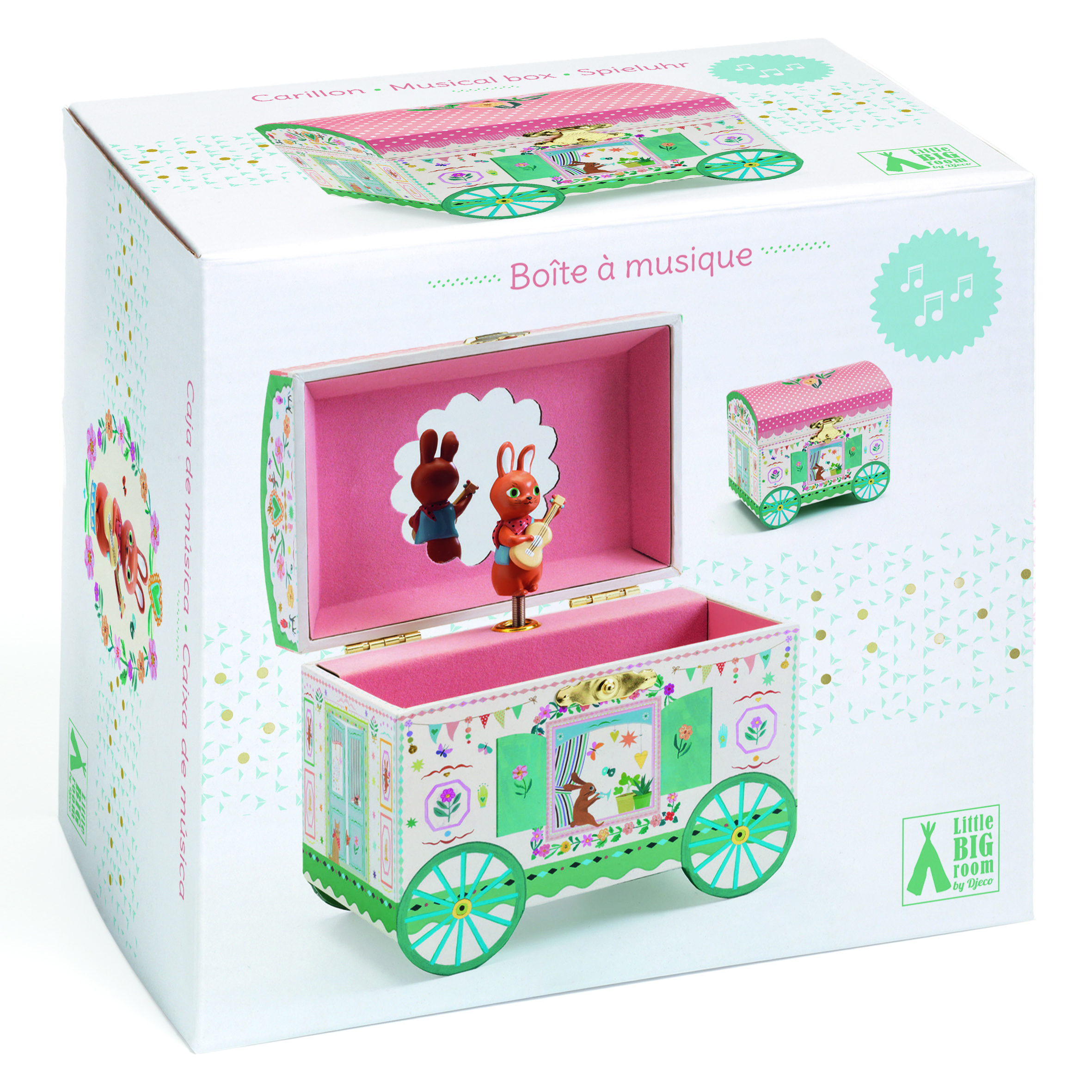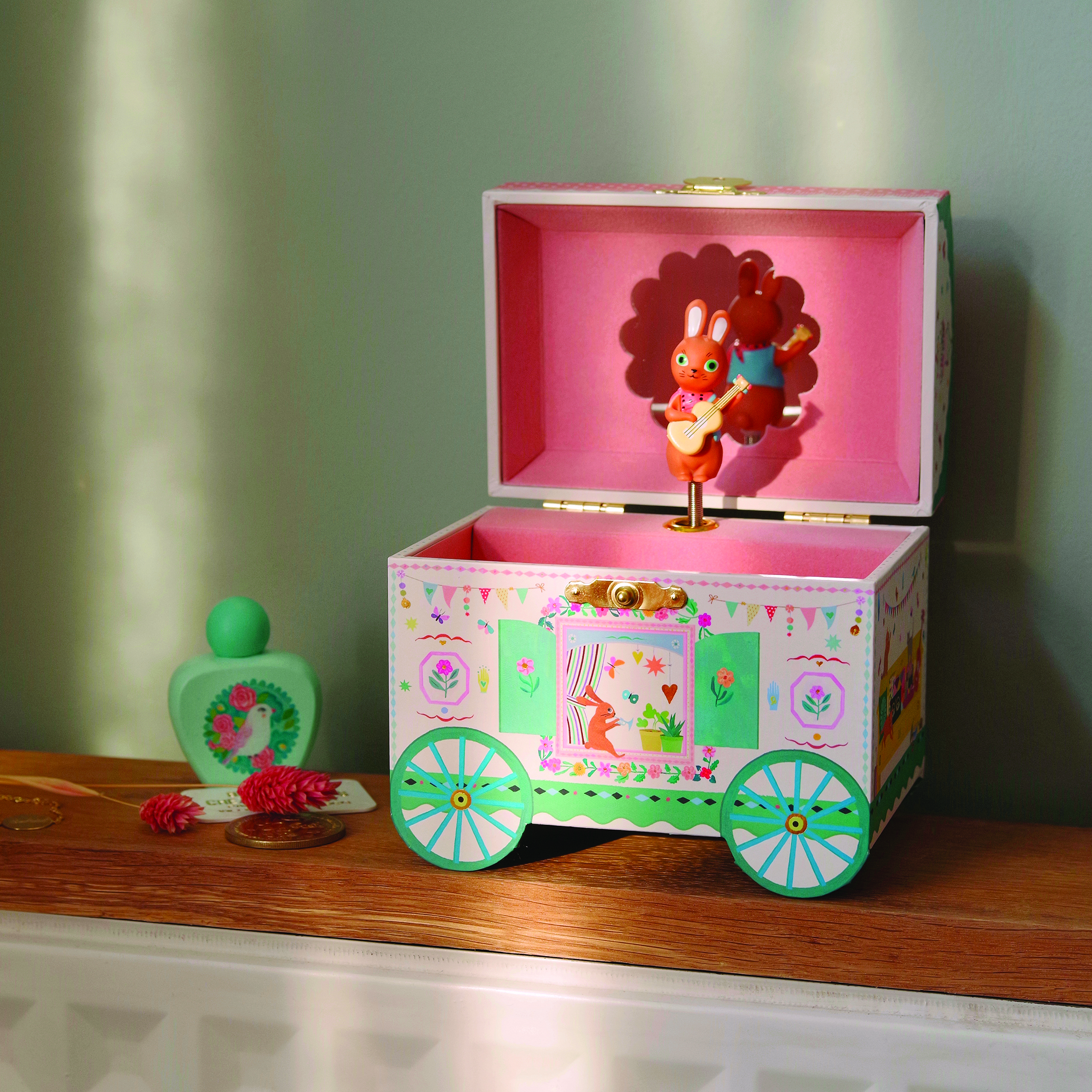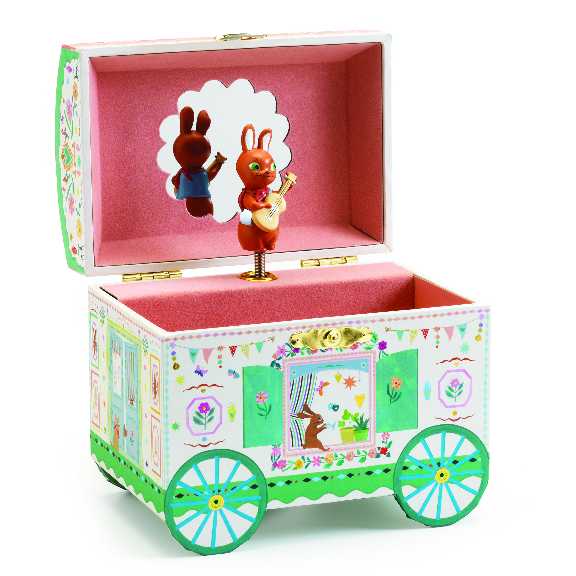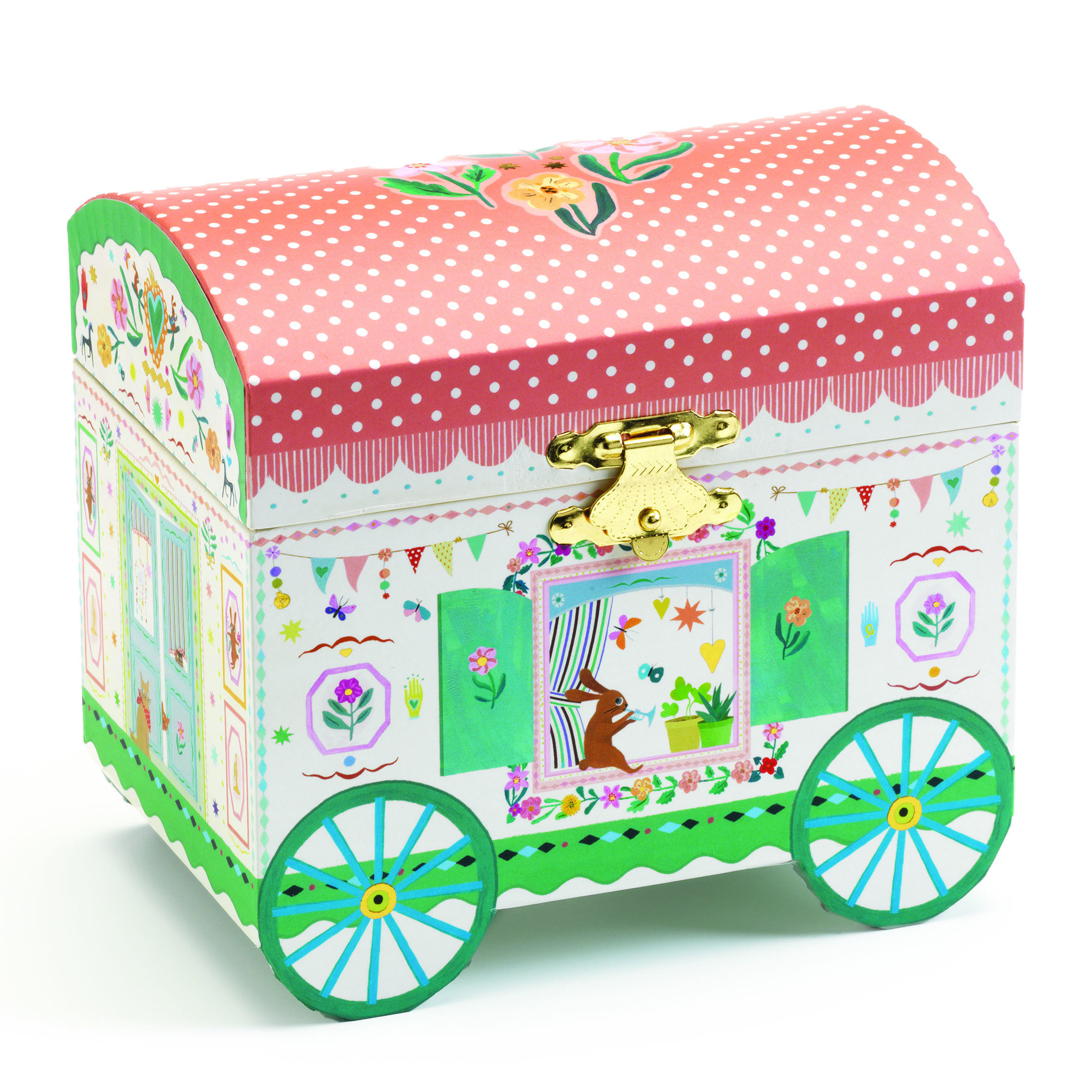 Roulotte enchantée — это красивая музыкальная шкатулка в форме каравана для хранения драгоценностей и секретных вещей. Поверните ручку и откройте шкатулку, чтобы увидеть сюрприз! Изящно вырезанный кролик поворачивается, отражаясь в фигурном зеркале, под «Le temps des cerises» Антуана Ронзона.