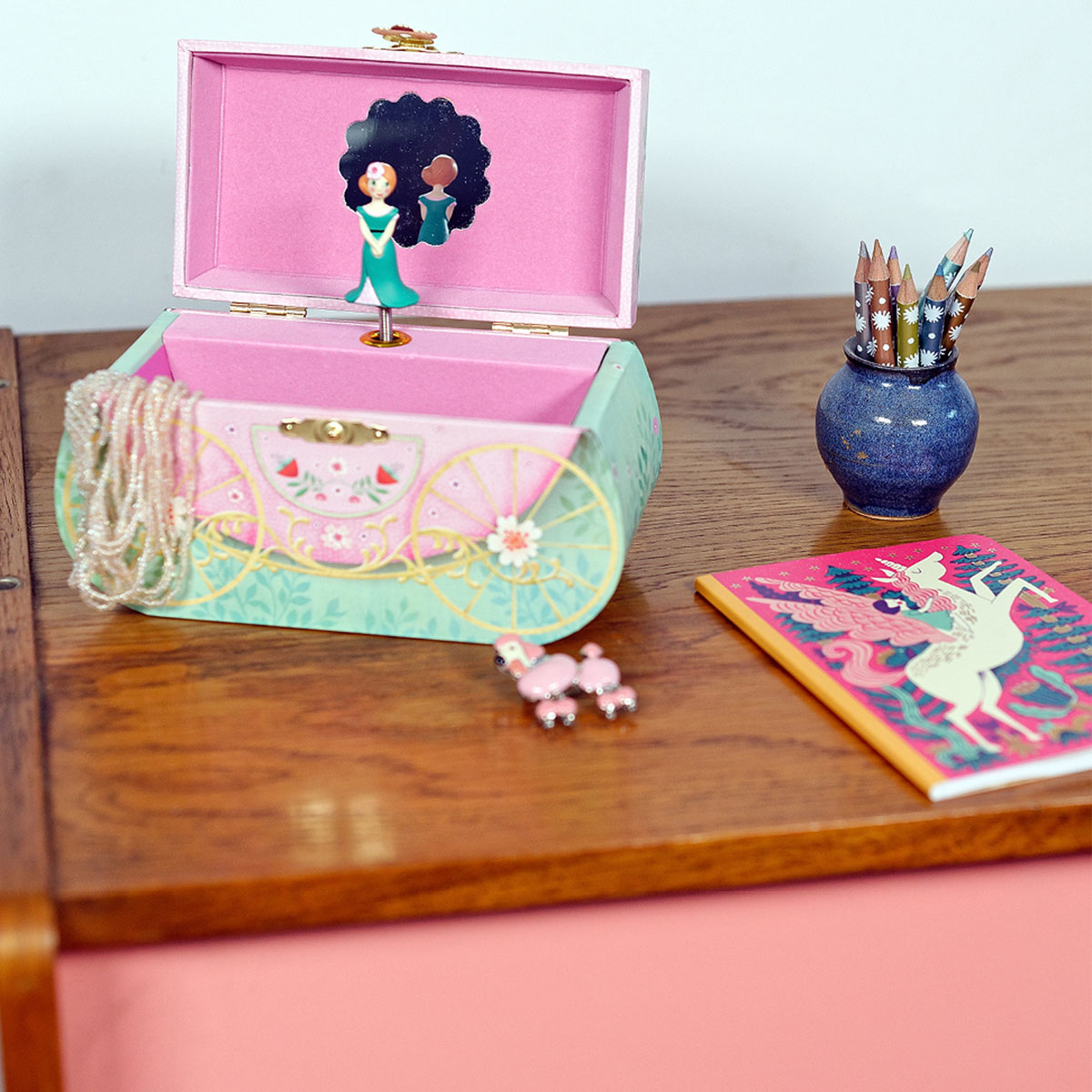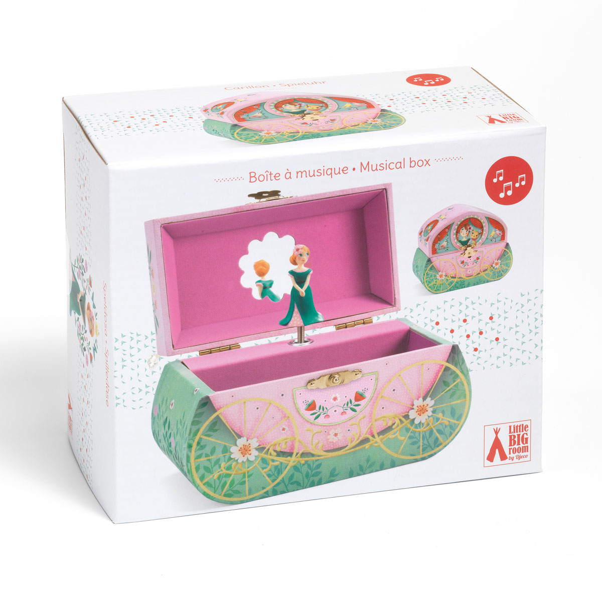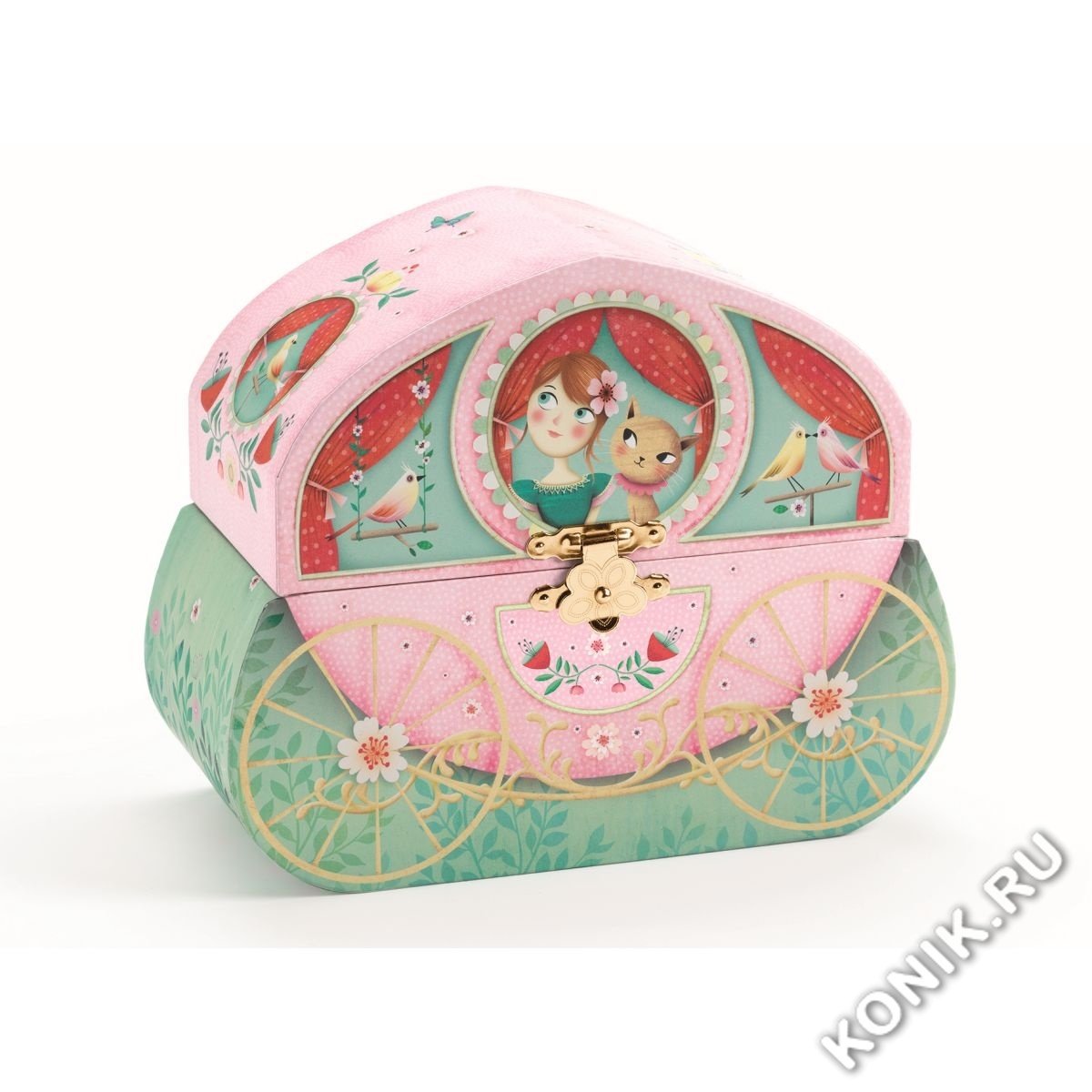 Carriage ride - это красивая музыкальная шкатулка в форме каретки для хранения украшений и секретных мелочей. Поверните ручку, откройте шкатулку, и она оживает: изящно вырезанная принцесса превращается, отражаясь в фигурном зеркале, под песню Лео Фридмана «Let Me Call You».