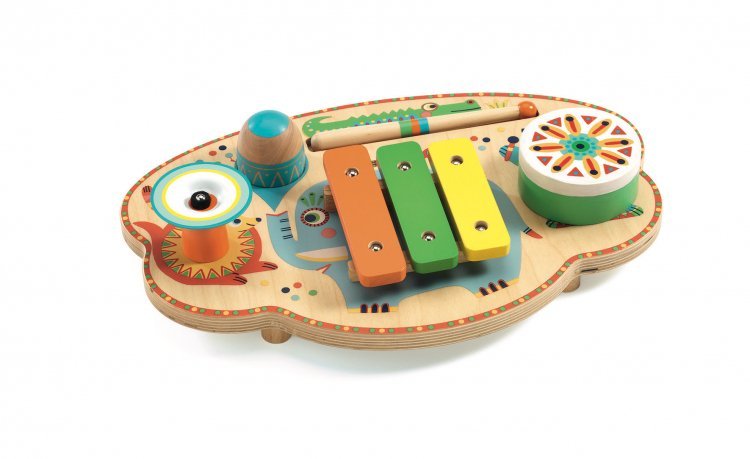 Прекрасно иллюстрированный музыкальный столик из дерева и металла, с помощью которого дети могут экспериментировать с различными инструментами: барабаном, ксилофоном, тарелкой и маракой. Идеальный подарок для приобщения малышей в возрасте от 2 лет и старше