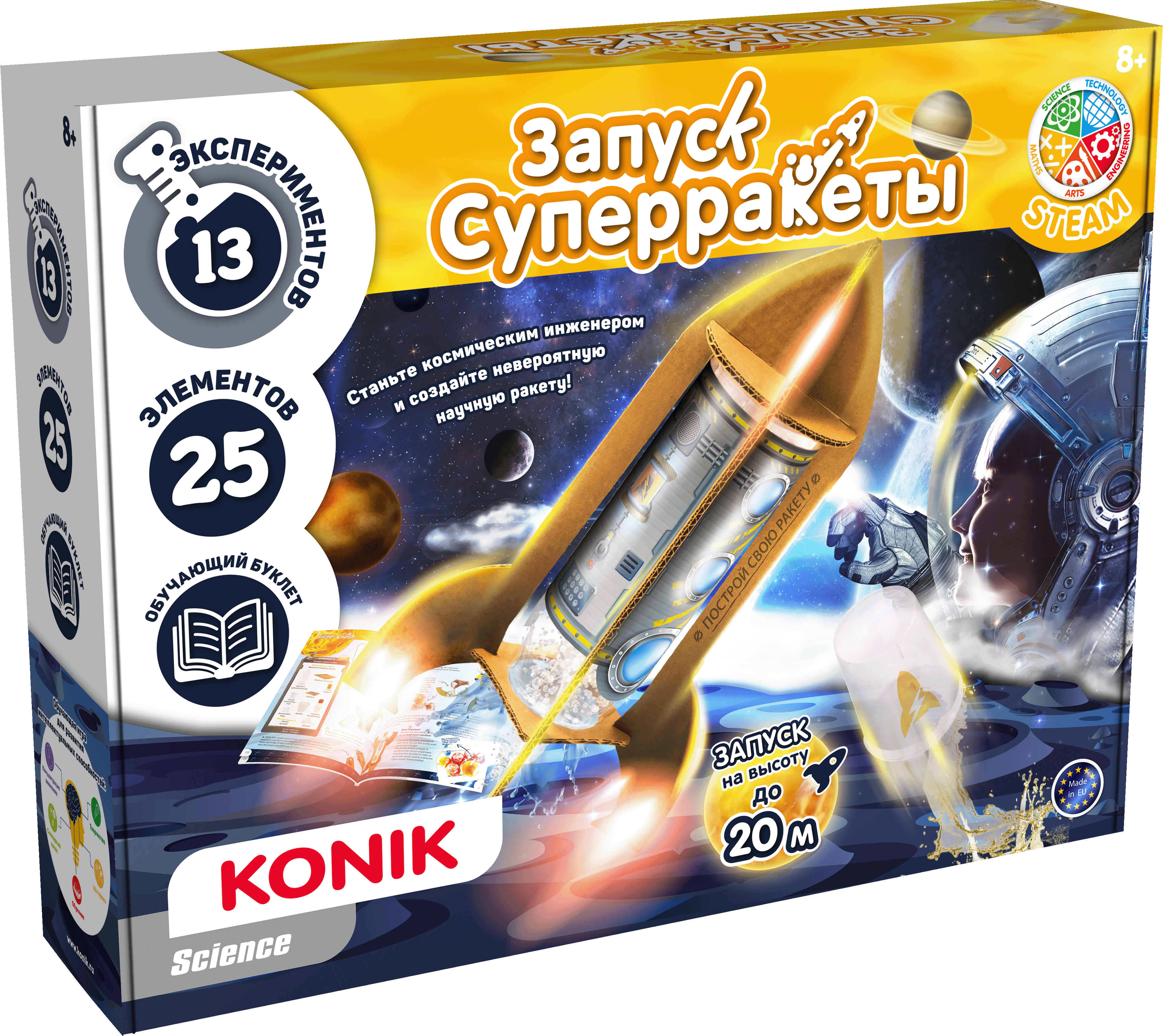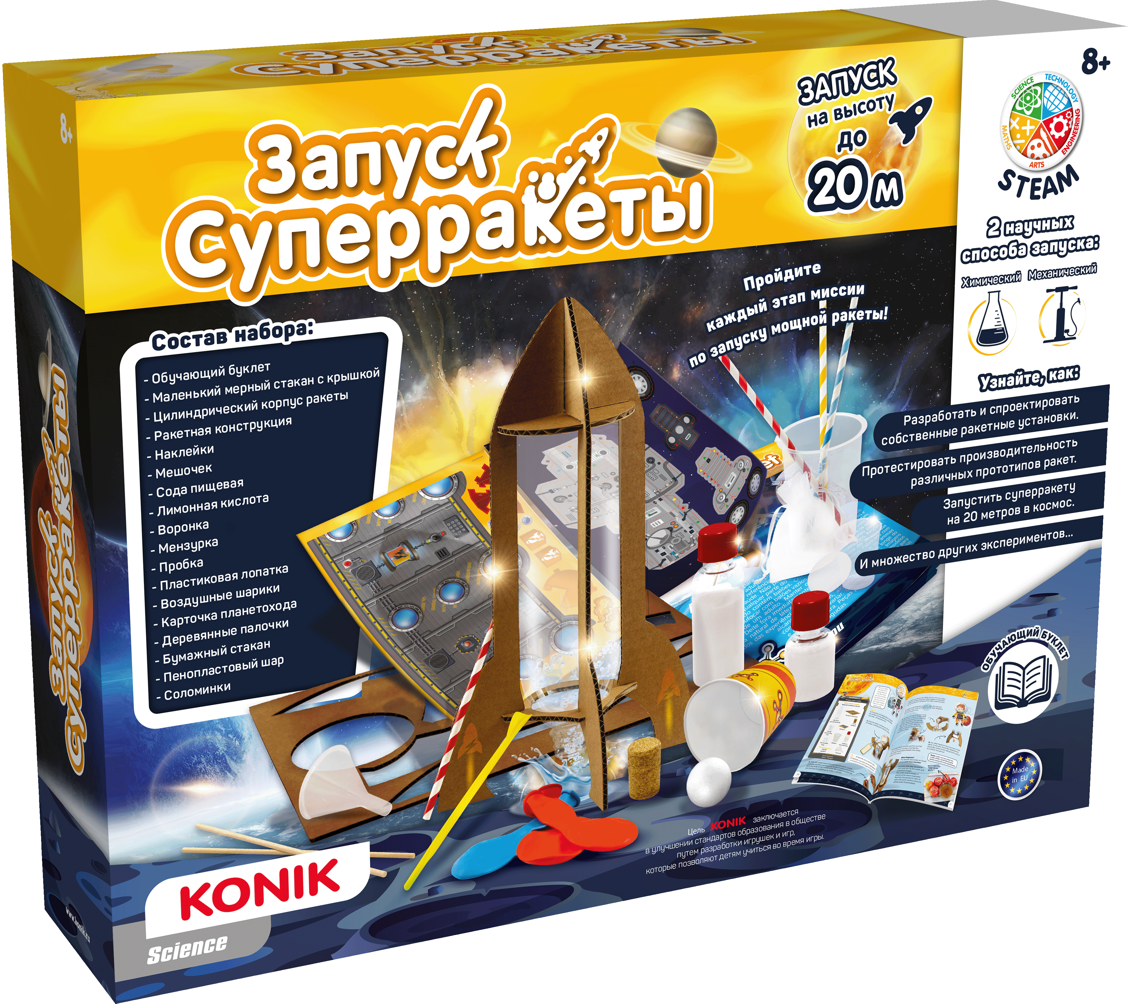 Узнайте, как разработать и спроектировать настоящий космический транспорт, как протестировать работоспособность различных прототипов космолетов, как запустить ракету на 20 метров и многое другое с набором от Konik Science.