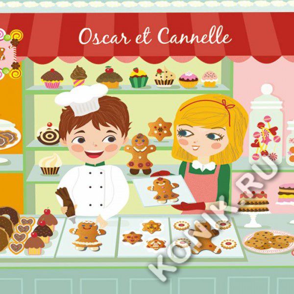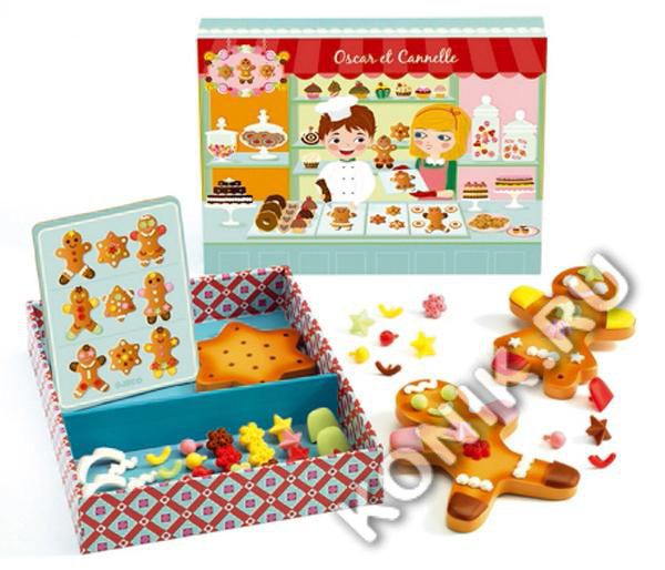 Oscar et Cannelle - это красивая коробка с тремя маленькими печеньками – двумя пряничными человечками и одной звездочкой, – которые дети могут украсить по образцам на открытке или по собственному дизайну.
