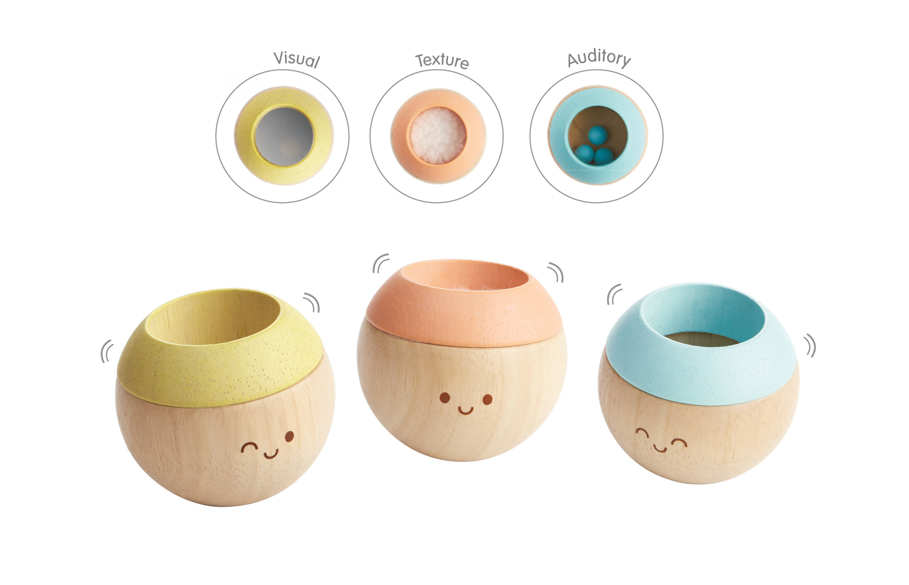 «Прикоснись и угадай» от PlanToys – это набор забавных неваляшек, который поможет вашему малышу развить свои чувства! Комплект включает в себя три разные сенсорные игрушки – слуховую, зрительную и тактильную, каждая из которых имеет свой оттенок.