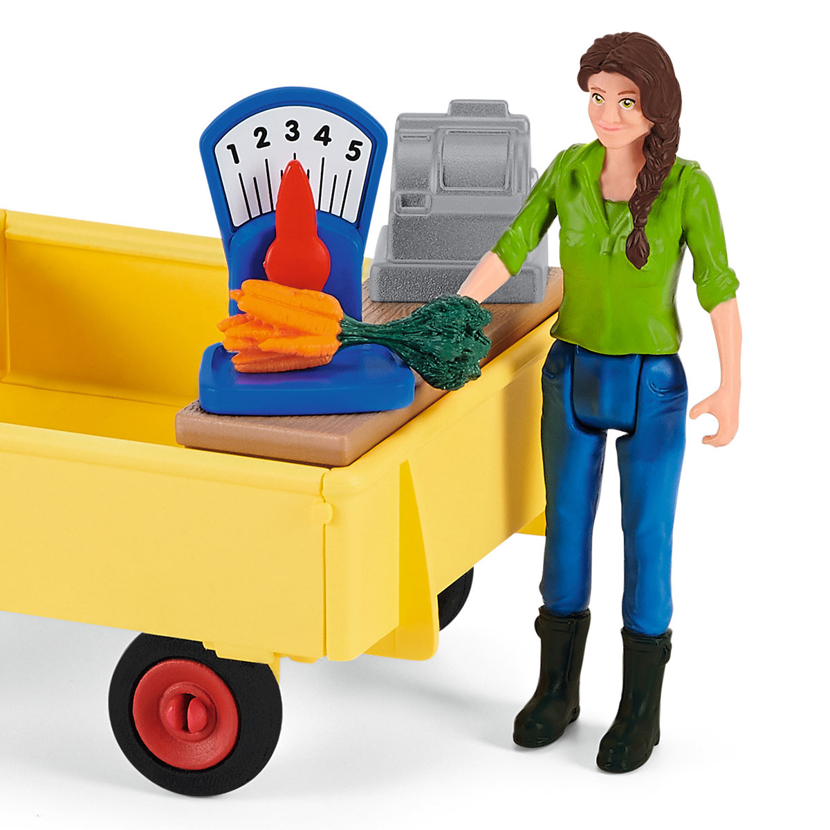В набор входит: фермер Лаура, мальчик Бен, 1 дартмурский пони, поясной ремень для пони, веревка, недоуздок, дышло, прицеп, 2 яблока, 2 хлеба, 2 салата, 2 картофеля, 1 морковь, доска для сэндвичей, солнцезащитный козырек, весы, бутылка для молока, яйца, 3 деревянных ящика, кассовый аппарат, скамейка.