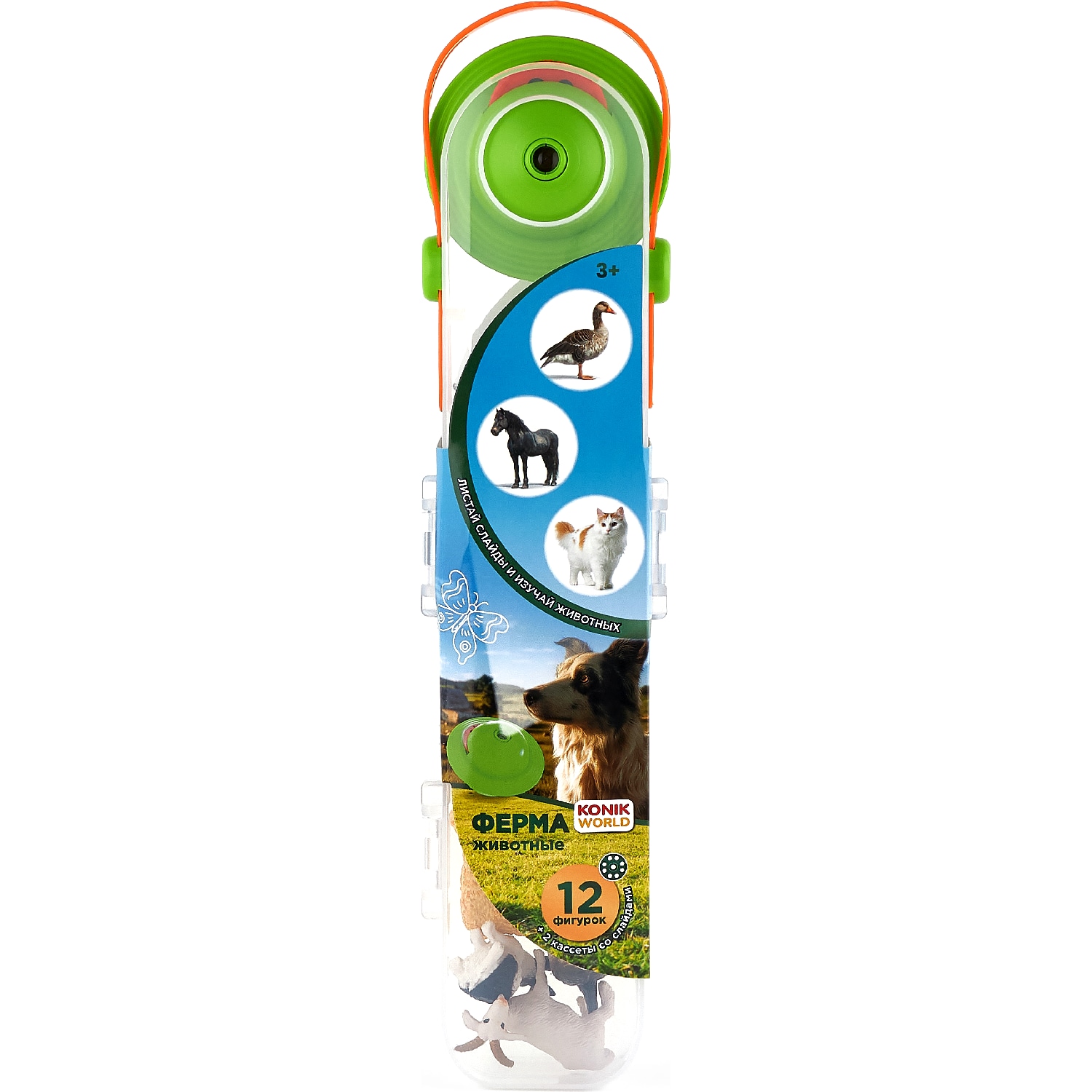 В комплект входят: корова, лошадь, осел, свинья, козёл, овца, гусь, собака, курица, кот, утка, кролик.