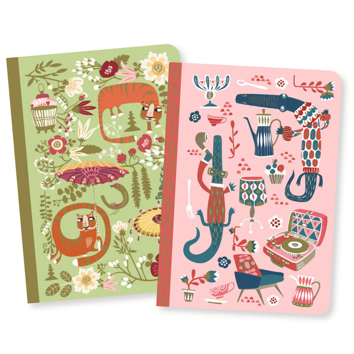 Набор блокнотов «Любовь Аса» от французского бренда Djeco порадует ценителей стильных канцелярских принадлежностей. В комплект входит 2 блокнота на 40 страниц, дополненных небольшими рисунками. Один из блокнотов пролинован, второй — с чистыми страницами. На обложках — причудливые иллюстрации с животными.