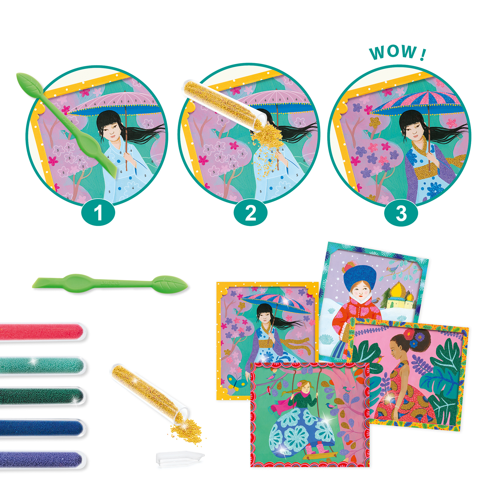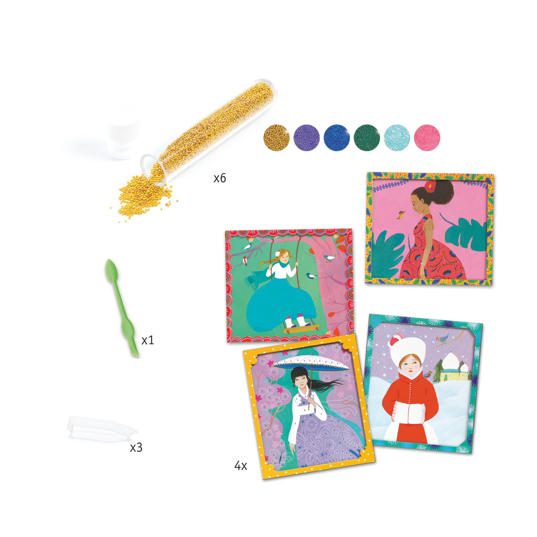 Набор для детского творчества «Четыре сезона» от французского производителя игрушек Djeco (Джеко) для декорирования картинок бисером прекрасно развивает мелкую моторику и концентрацию внимания, формирует цветовосприятие и эстетический вкус ребёнка.