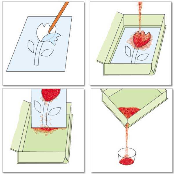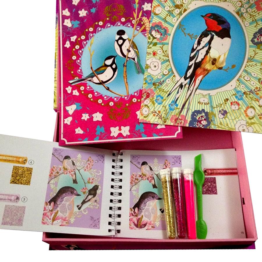 Как это работает? Картинки, на которых изображены птицы, помещаются в коробку, далее отклеивается одна из деталей, и на это клейкое место высыпаются соответствующего цвета блёстки, лишнее счищается кисточкой и высыпается через специальное отверстие в коробке. Получаются невероятно красивые изображения, переливающиеся и блестящие всеми цветами радуги.