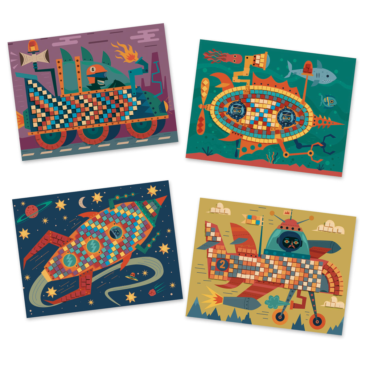 Мозаика «За штурвалом» от Djeco — это две красочные картинки, которые необходимо заполнить с помощью цветных квадратиков с блестками. Ребёнку просто нужно наклеить их вместо цифр и шедевр готов!