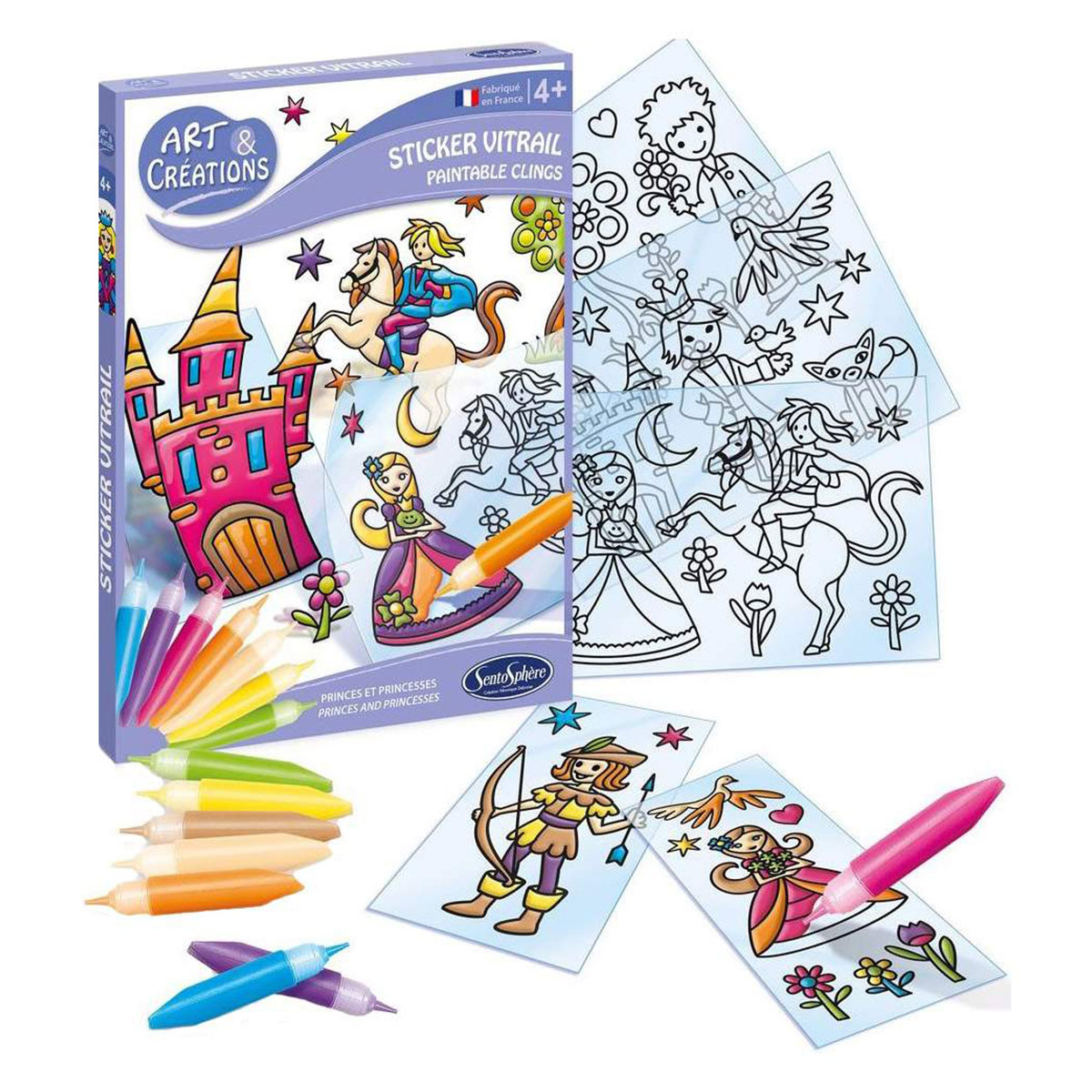 Набор для декорирования «Принцы и принцессы» от французского производителя SentoSphere, с которым ребёнок сможет создать великолепные витражи с изображением сказочных принцев и принцесс и украсить ими окна, холодильник, вазы или другие гладкие поверхности. Благодаря монтажной рамке контуру рисунка, ребёнок не выйдет за границы раскрашиваемого элемента и краски не будут растекаться. Получившиеся картинки легко отклеиваются, не оставляя следов.