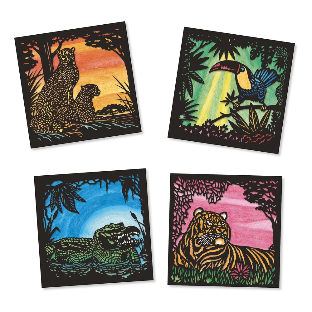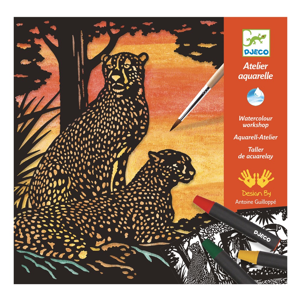 Набор для творчества «Тени» от французского производителя игрушек Djeco (Джеко), где ребёнку необходимо раскрасить мелками 4 картины с изображениями животных, а затем мокрой кистью размыть цвета, чтобы получился акварельный рисунок.