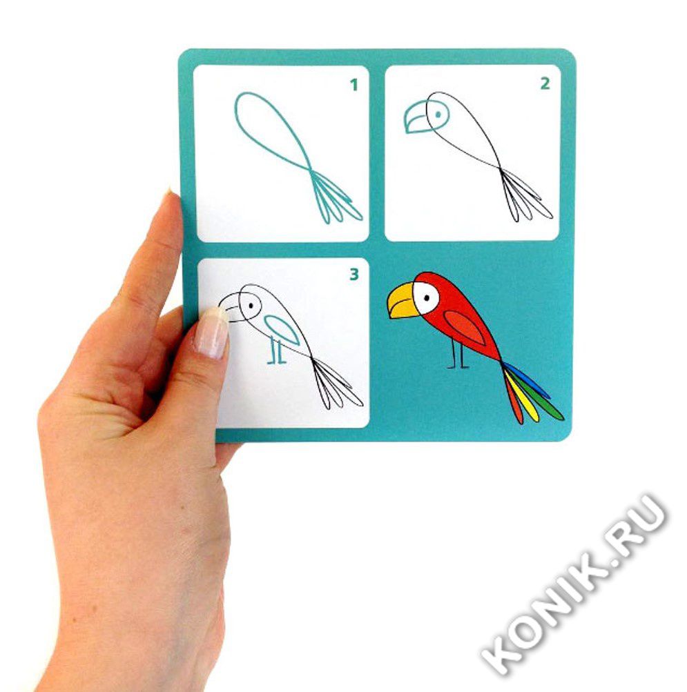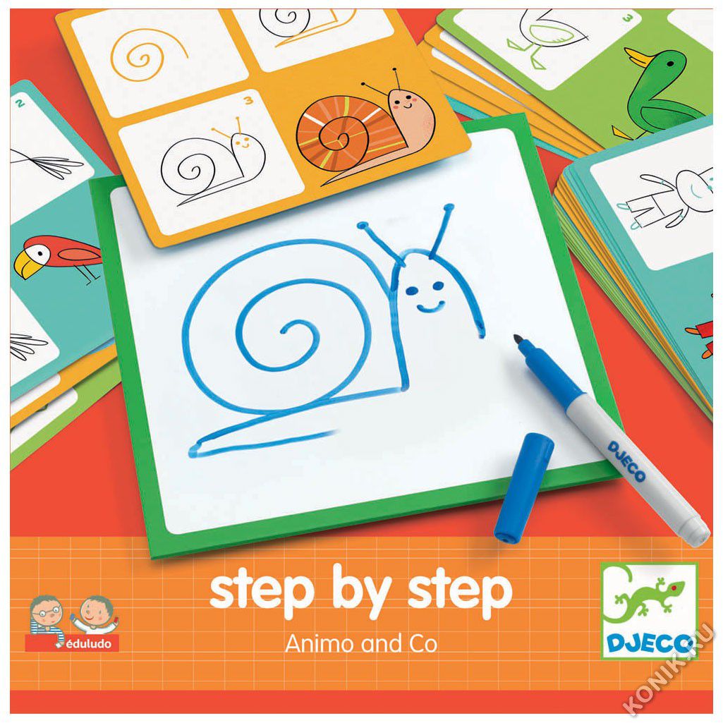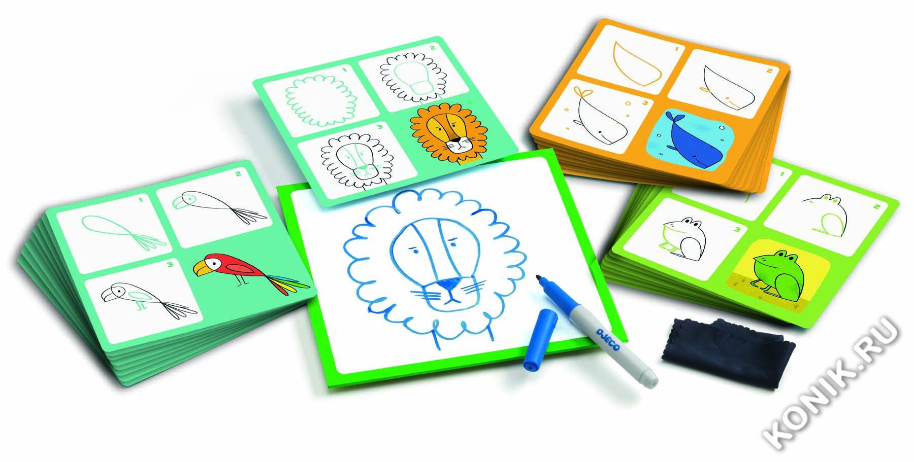 Настольная игра «Животные и Ко» от французского производителя Djeco (Джеко) научит Вашего малыша рисовать и погрузит его в художественный и творческий мир. В набор входит 24 карточки, на которых поэтапно нарисованы животные, рыбки, птицы и другие существа. В комплекте есть также доска для рисования и фломастер. Ребёнок должен будет воспроизвести изображение согласно карточке с заданием. Небольшой текстильный лоскут позволит стирать рисунок и рисовать снова и снова.