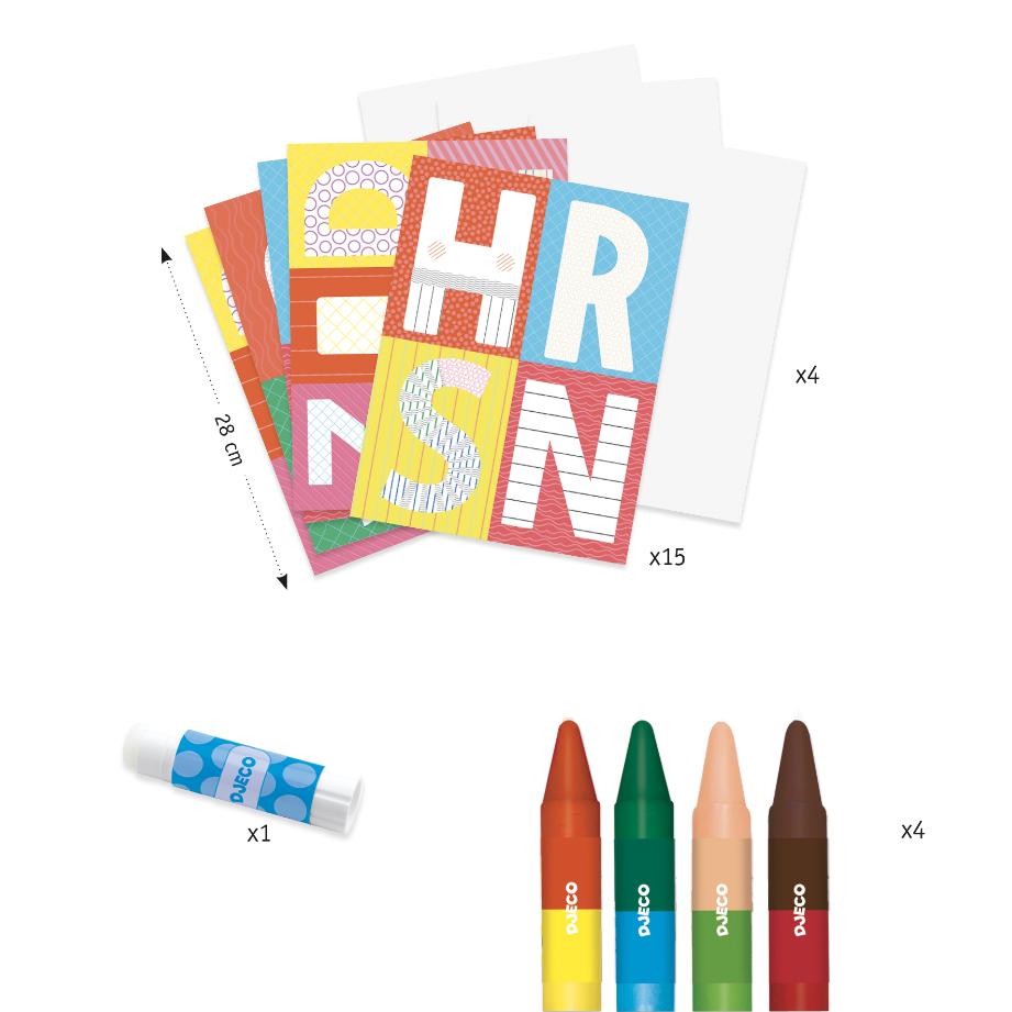 Набор для творчества «Буквы» от французского производителя игрушек Djeco (Джеко) для создания аппликаций поможет вашему ребёнку изучать английский алфавит в игровой форме, обучающий процесс будет очень увлекательным и красочным.