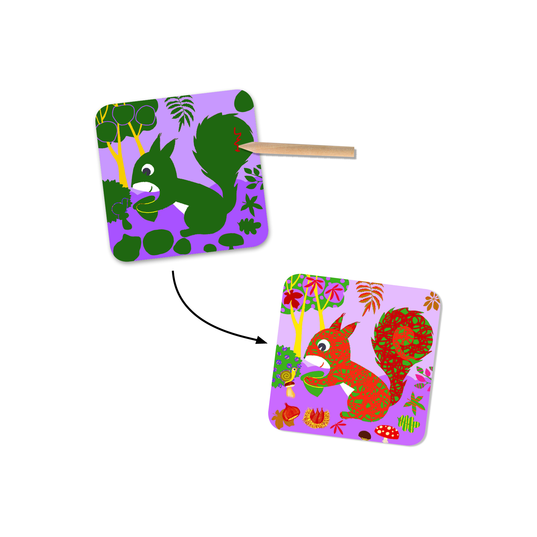 Сретч-картинки с лесными животными понравятся каждому юному художнику! Детям будет интересно царапать палочкой, придумывать узоры и делать открытия!