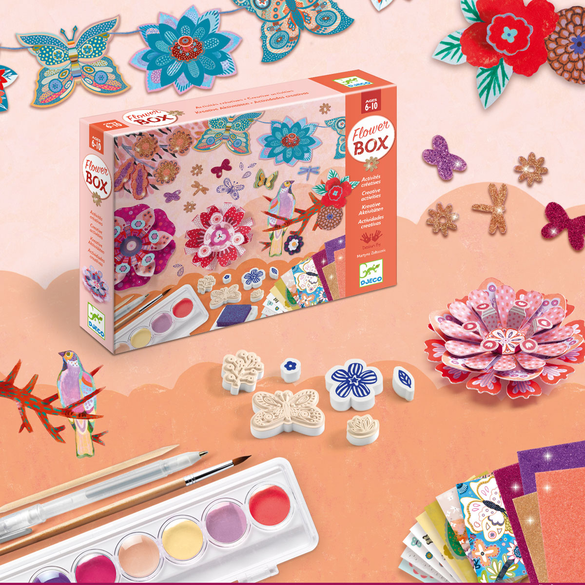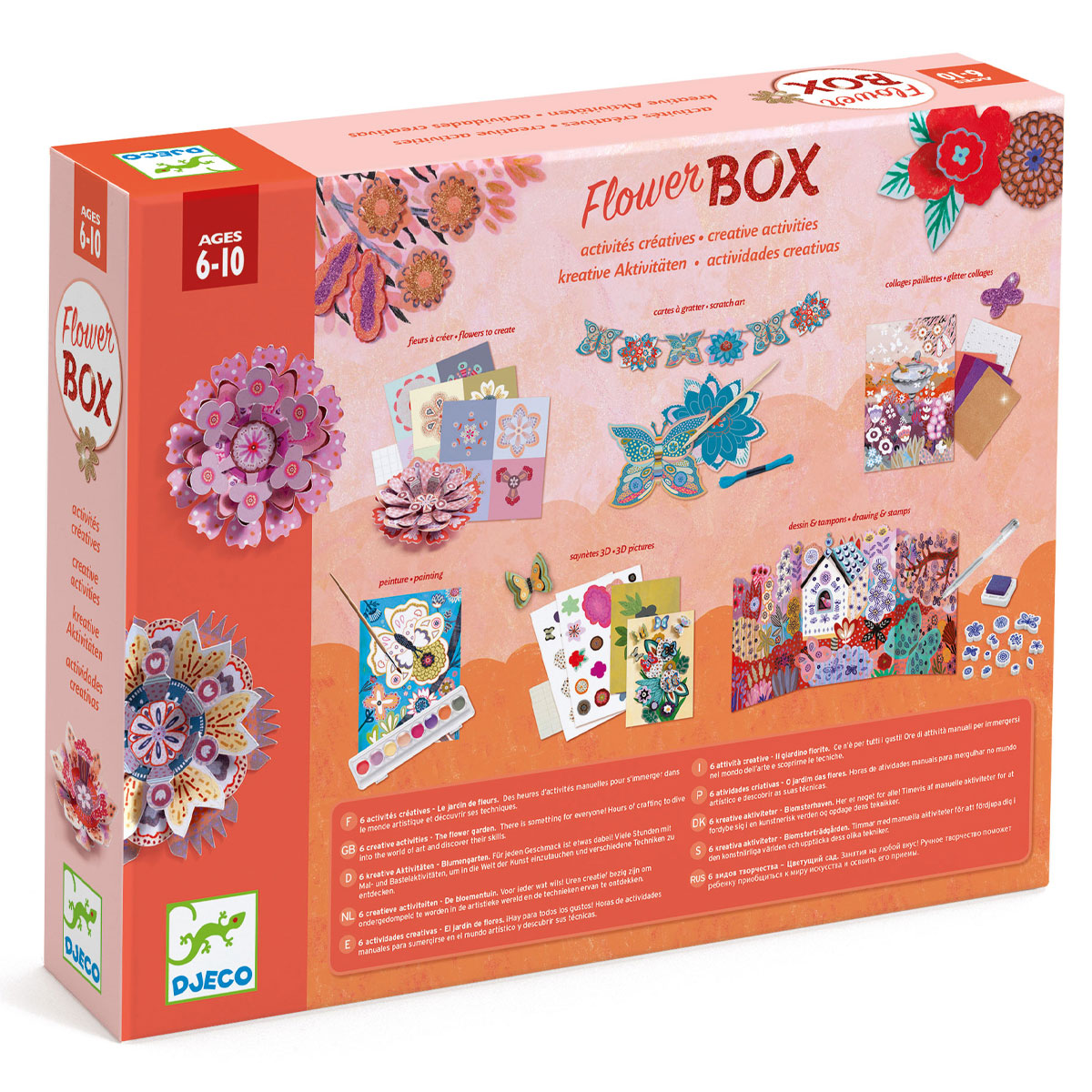 Набор для творчества «Flower Box» от французского производителя игрушек Djeco (Джеко) познакомит ребёнка с 6 различными техниками художественных работ и увлечёт его на долгое время.