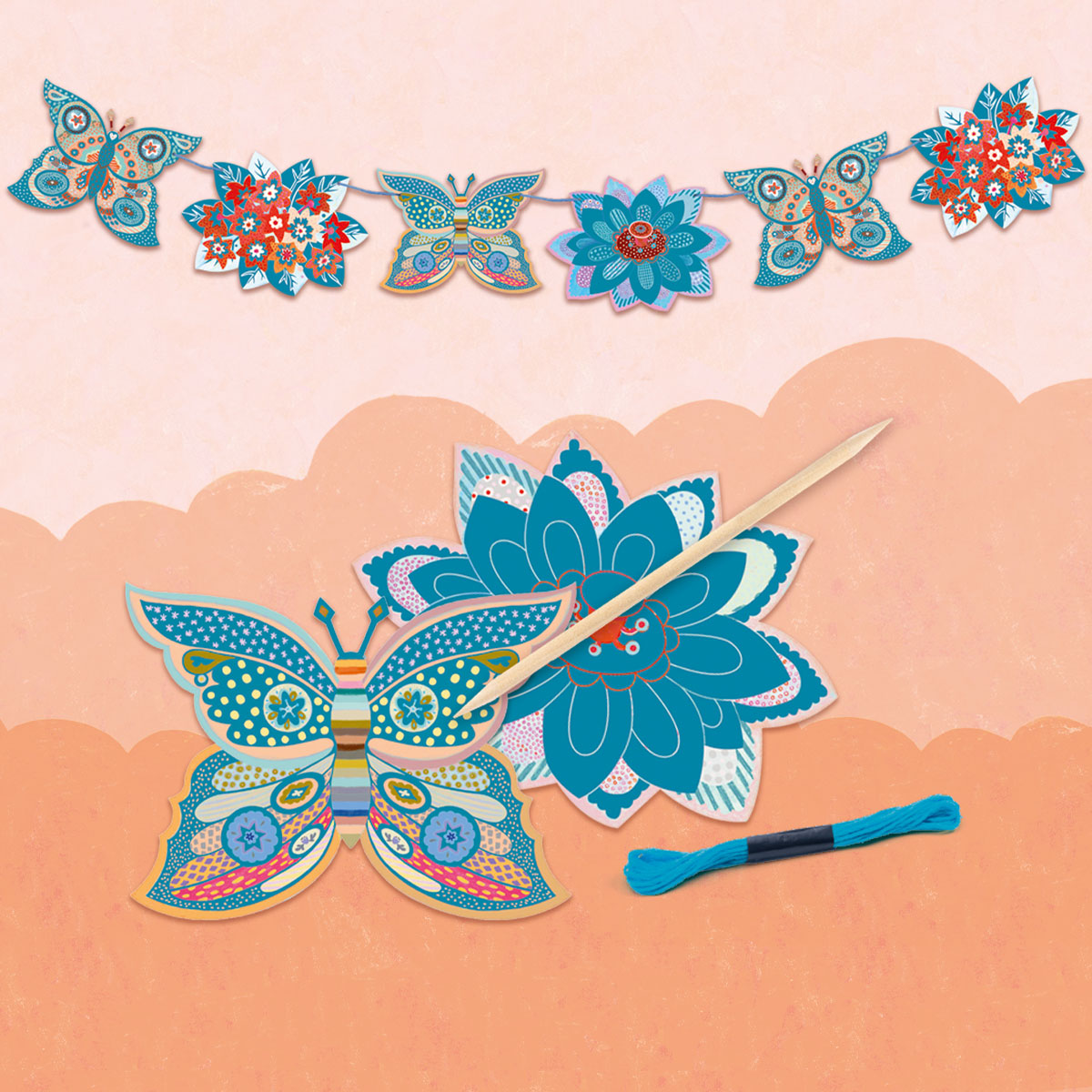 гирлянда (4 картинок, 1 деревянный стек, 1 моток ниток);