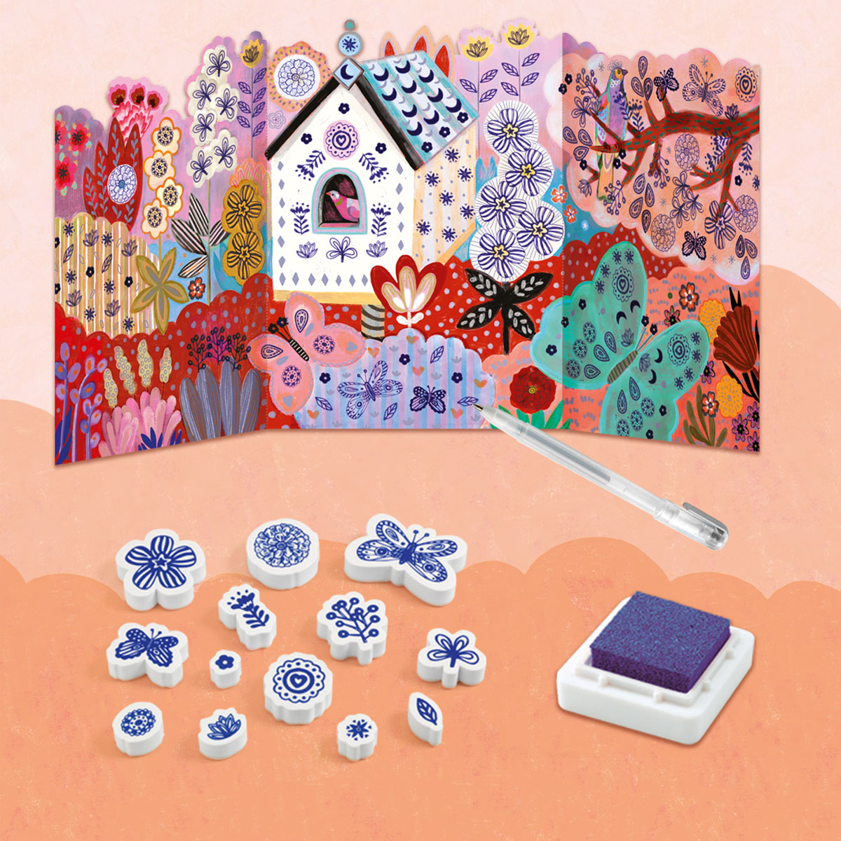 штампы (1 картина-основа, 1 ручка, 13 форм-штампов, 1 подушечка с чернилами);