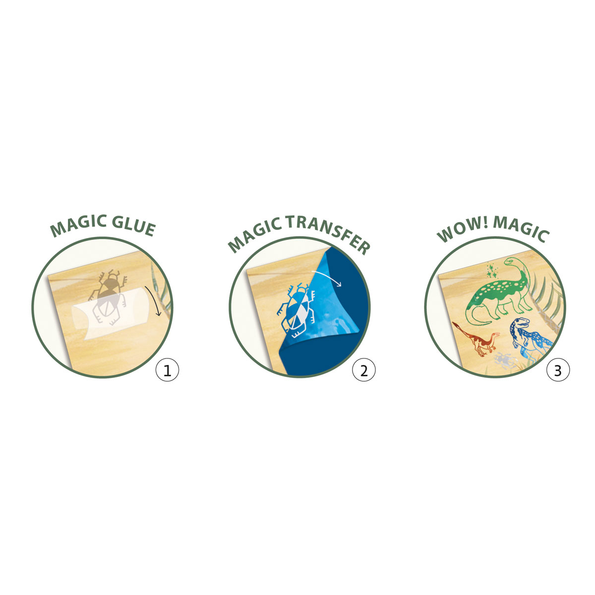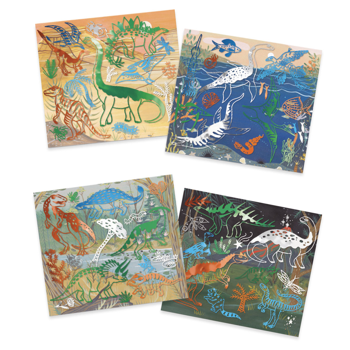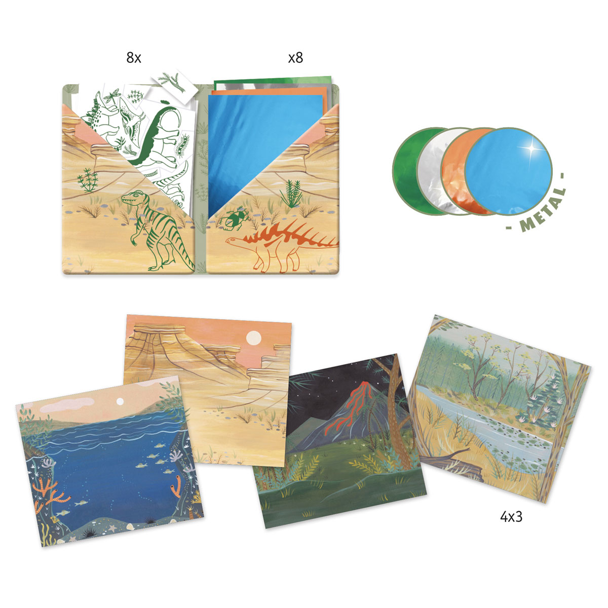 Набор для творчества «Динозавры» от французского бренда Djeco позволит ребёнку дать волю фантазии. В процессе игры предлагается украсить карточки переводными картинками с эффектом «металлик», получившиеся картинки можно использовать как закладки для книг, так и в качестве украшения детской комнаты.