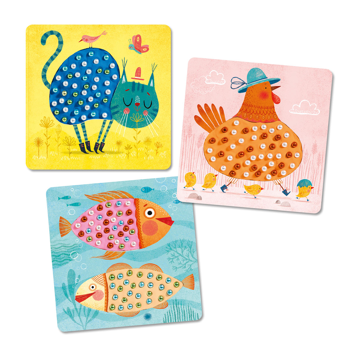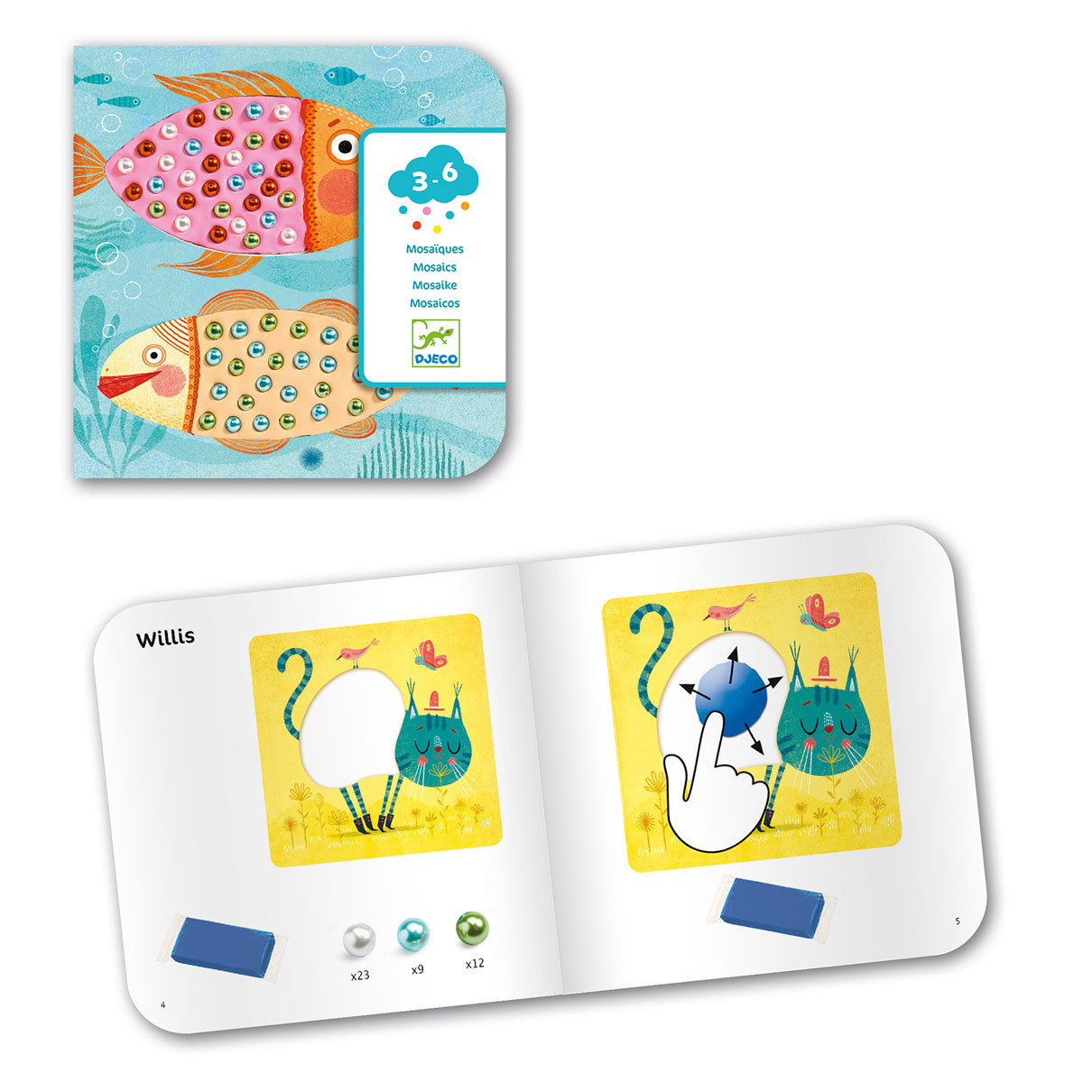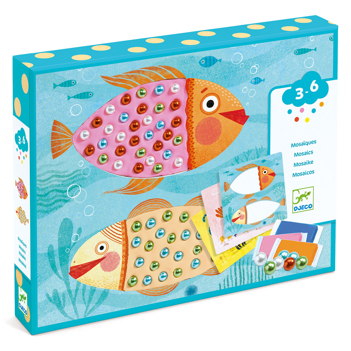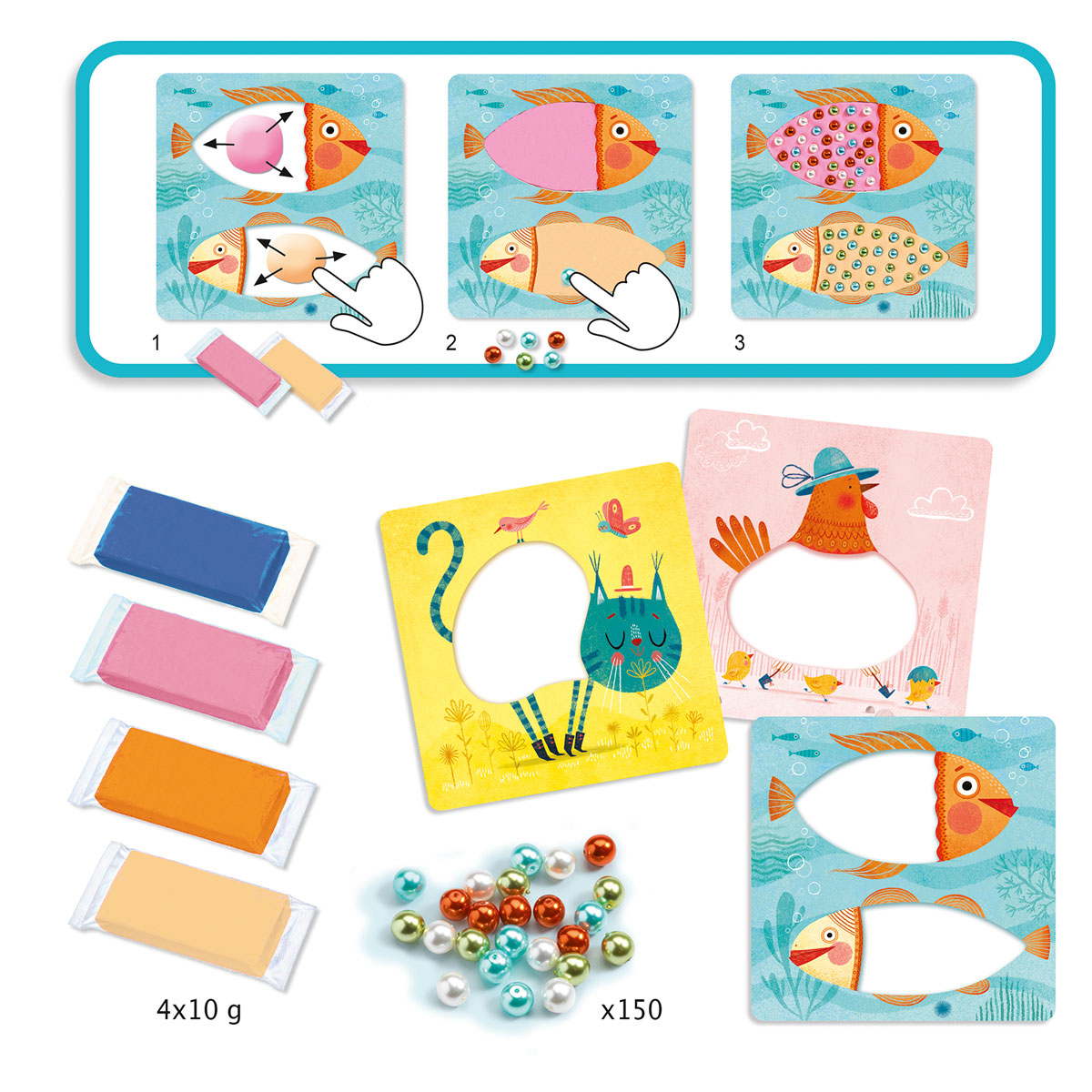 Набор для творчества «Рыбки» — это креативная мозаика с бусинами от французского бренда Djeco. Ребенку предстоит заполнить картинки цветной пластичной глиной и украсить их перламутровыми бусинками.