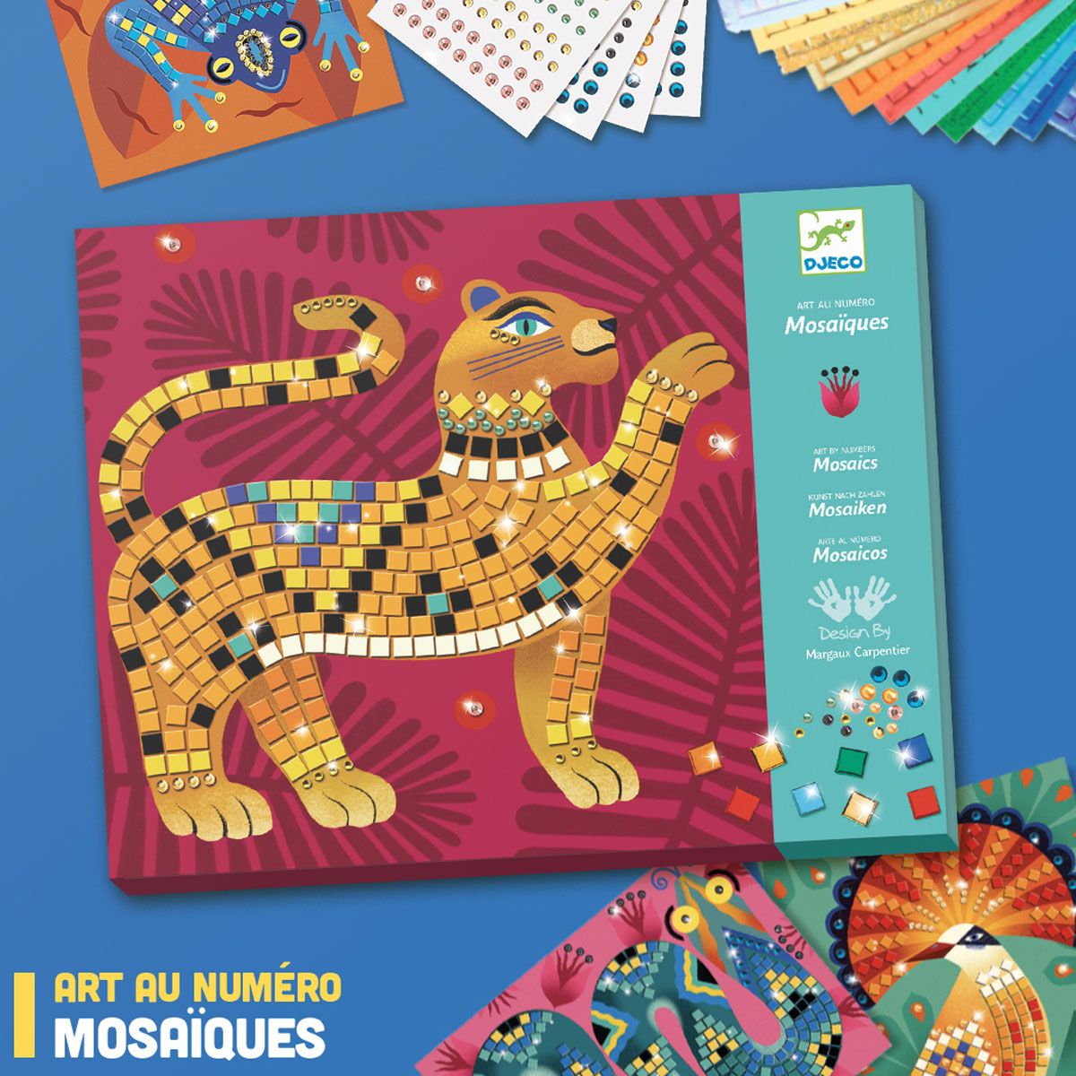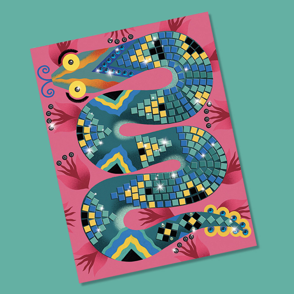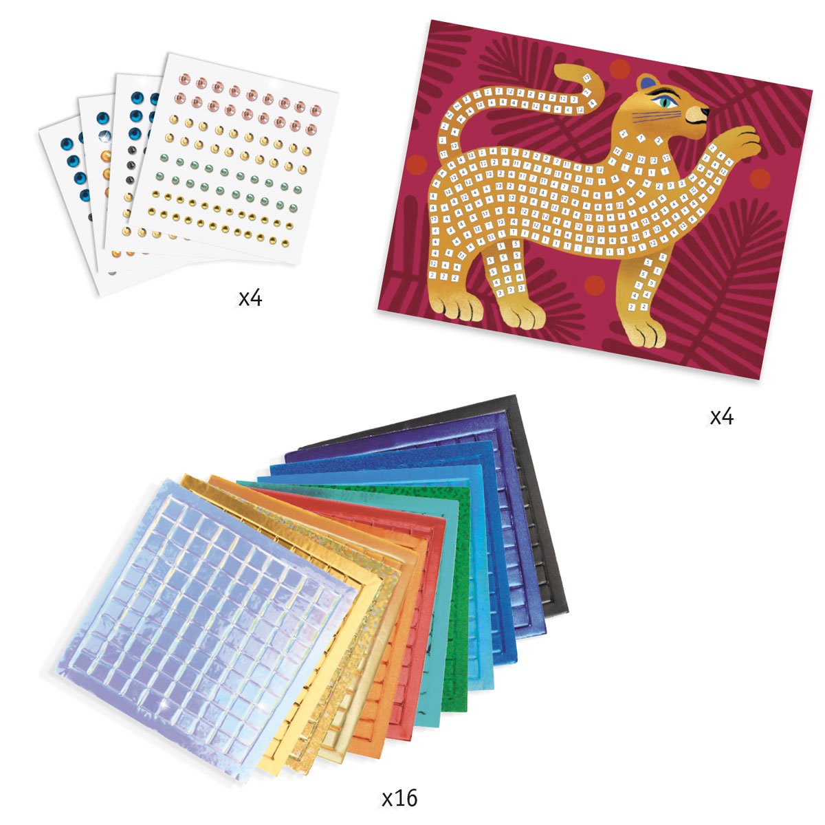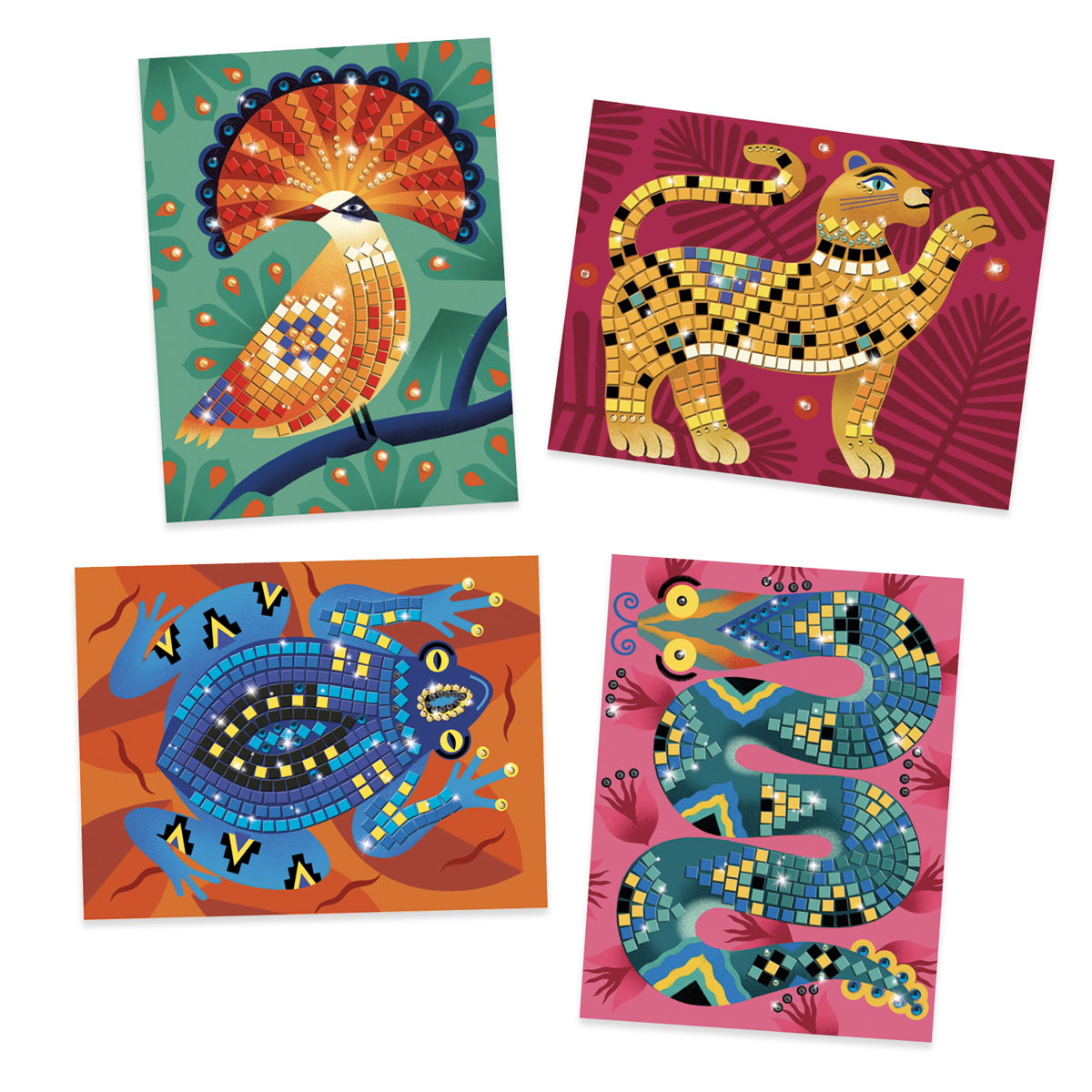 Мозаичный набор «В джунглях» от бренда Djeco развивает у ребёнка фантазию и творческие способности, учит малыша внимательности и усидчивости. Детям предлагается следовать цветовой кодировке, указанной на листах, и наклеивать самоклеющиеся стразы и цветные квадратики.