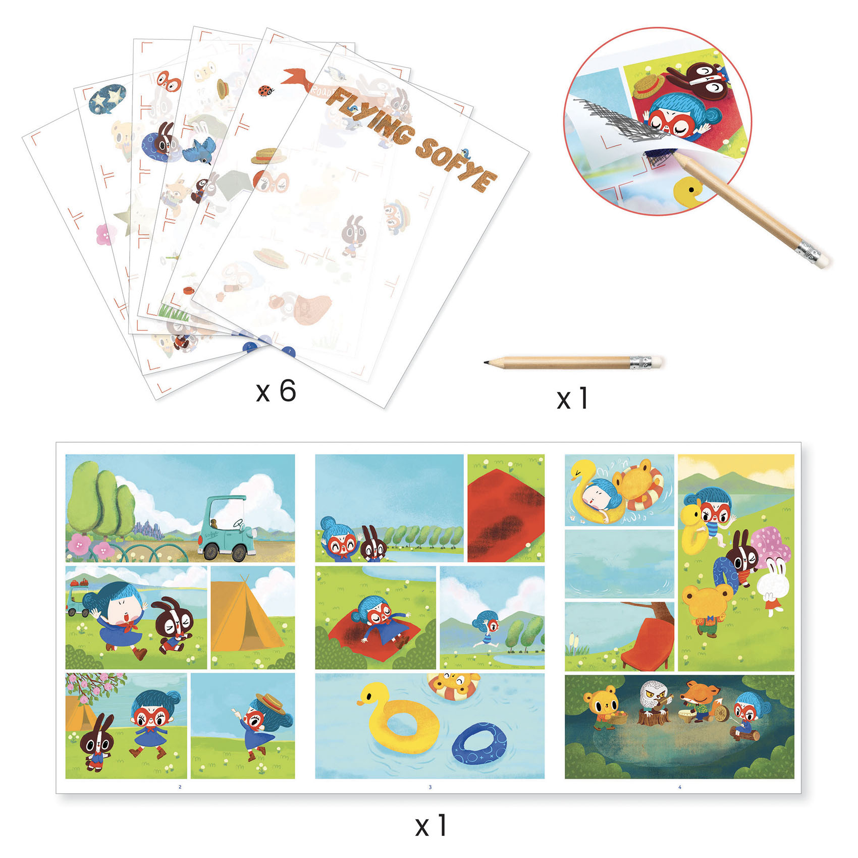 Дети смогут создать своими руками комикс с забавными и милыми персонажами с помощью декалей: они растирают изображения карандашом, и изображение переносится на комикс. Шаг за шагом дети размещают элементы на иллюстрированных досках, чтобы завершить историю, которая обретает форму на их глазах.