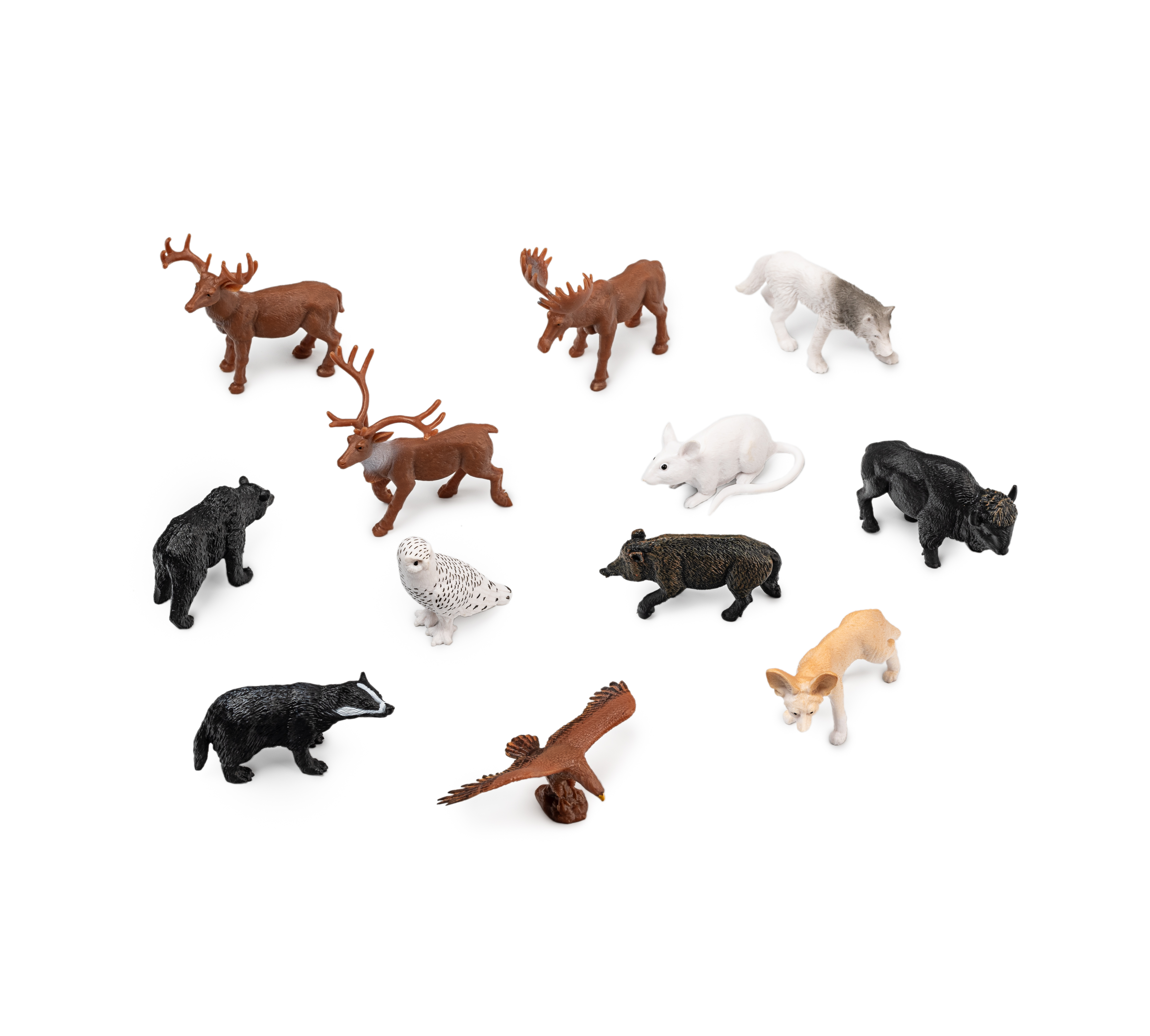 В наборе 12 фигурок различных животных, обитающих в дикой природе,