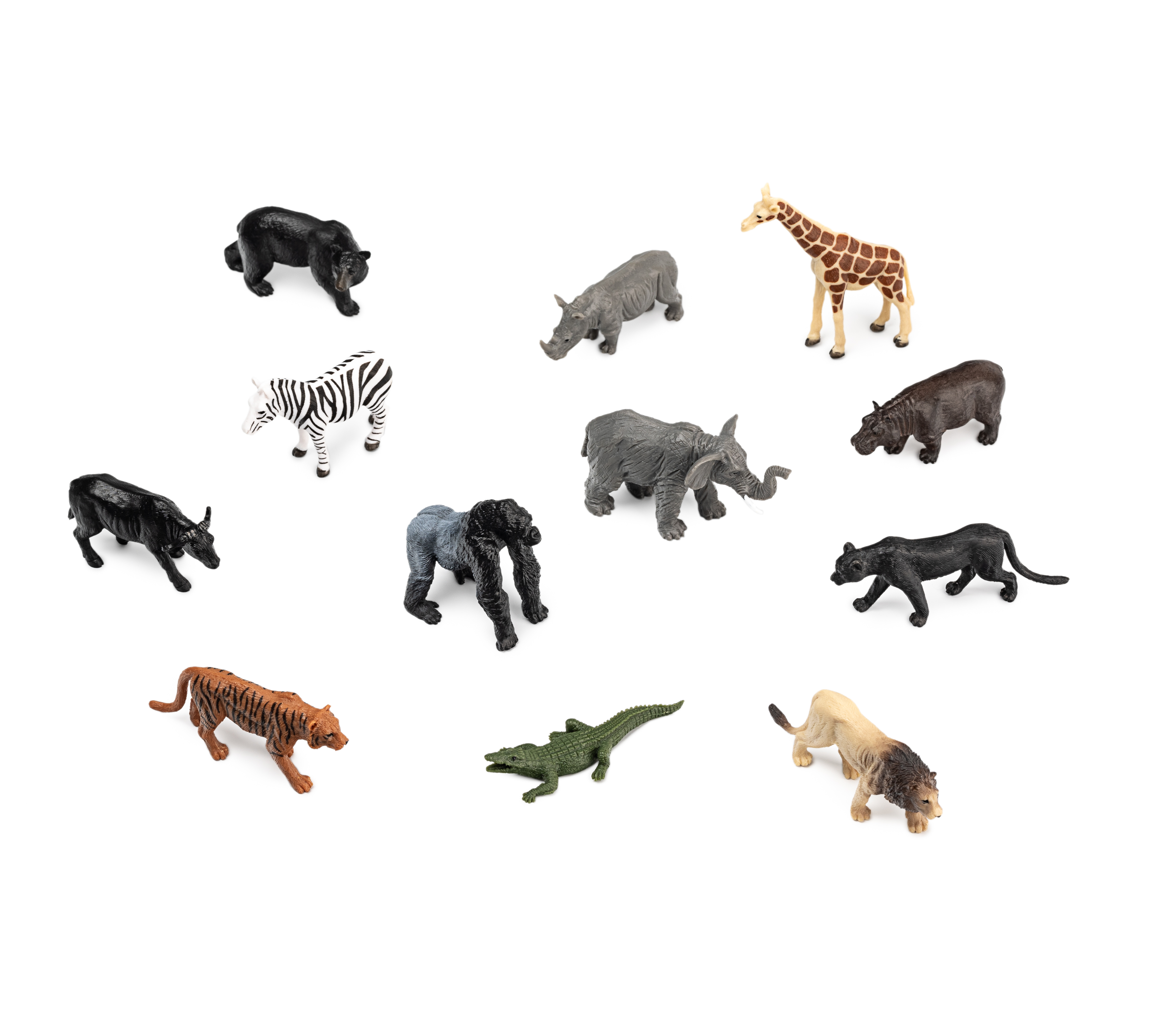 В наборе 12 фигурок различных животных, обитающих в дикой природе,