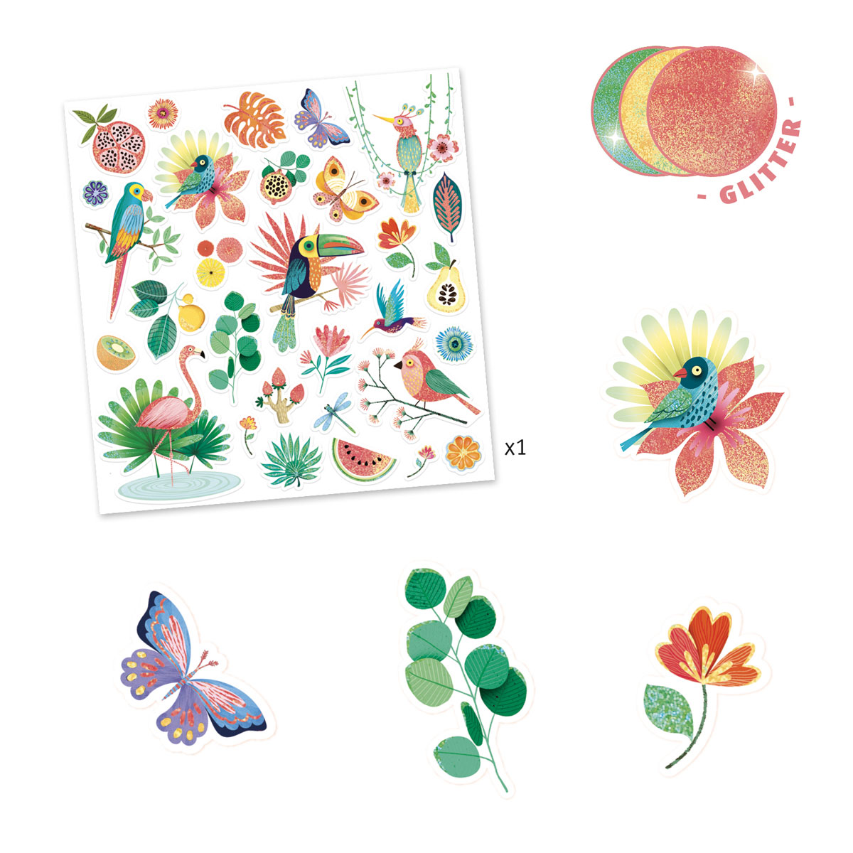 Яркий набор наклеек с блестками «Рай» от Djeco - эксклюзивная возможность оживить обыденность и добавить яркости и чуда в вашу жизнь! Экзотические птицы и принты великолепно украсят любую тетрадку, учебник, альбом или приглашение на детский праздник. Создавайте своими руками красивые открытки или аппликации и порадуйте своих близких и друзей.