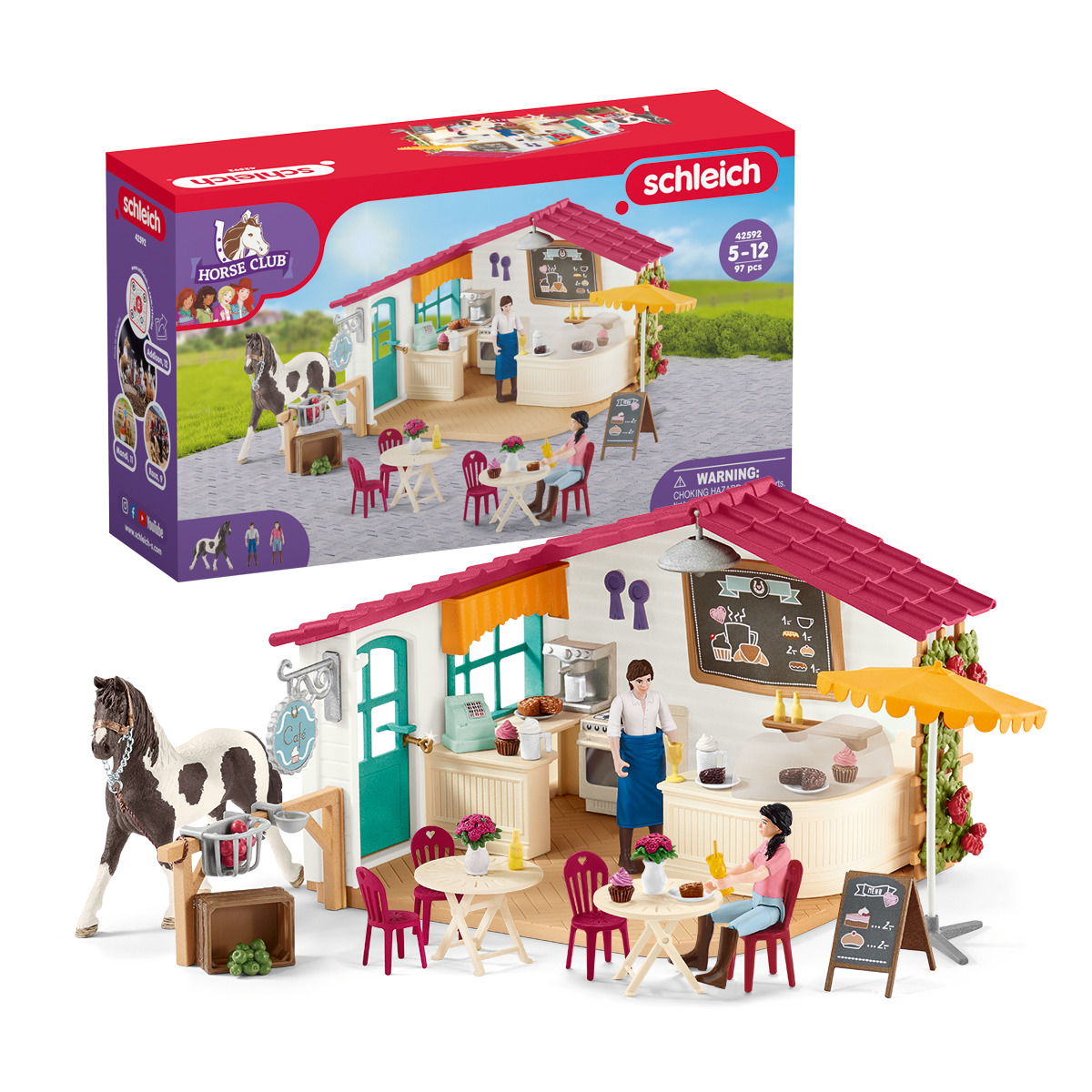 С этим набором серии Horse Club от Шляйх ребенок сможет создать свою собственную историю о кафе для наездников, отдыхе после соревнований или просто встрече друзей. В наборе есть всё необходимое: здание кафе с различными постройками, фигурки людей и животных, а также аксессуары для создания атмосферы уюта и гостеприимства.