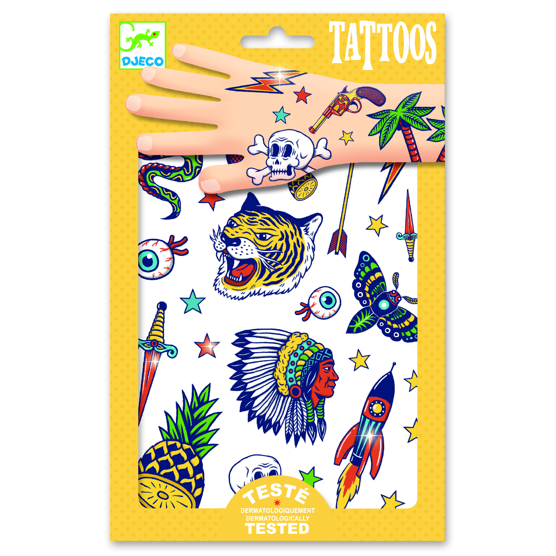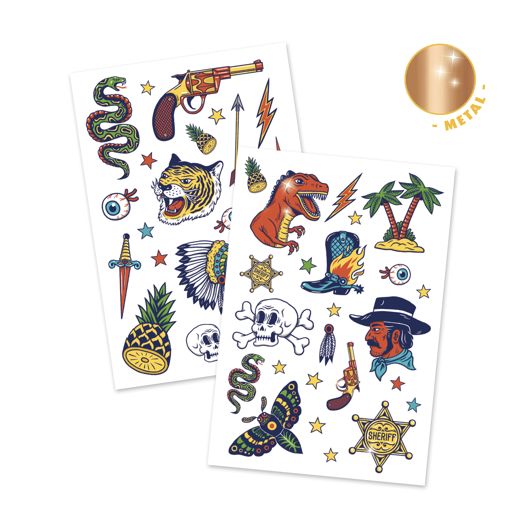 Два листа временных татуировок, на которых изображены любимые рисунки детей: ковбои и индейцы, динозавры, животные, черепа и скрещенные кости... Здесь найдется что-то для каждого! Детям понравятся эти татуировки с золотыми деталями! Их предварительно нарезают, чтобы ими было удобно пользоваться, и смывают небольшим количеством воды. Дерматологически протестировано.