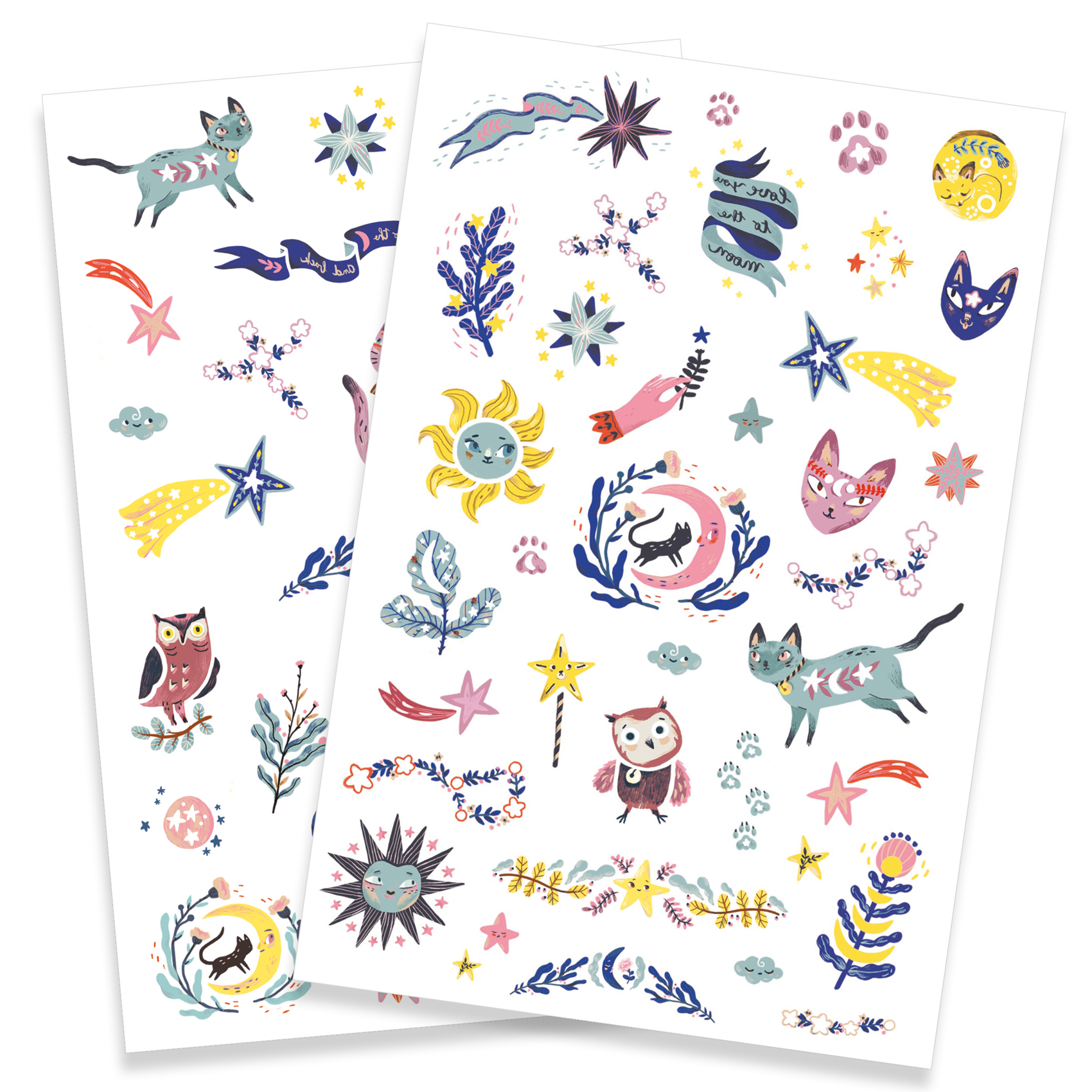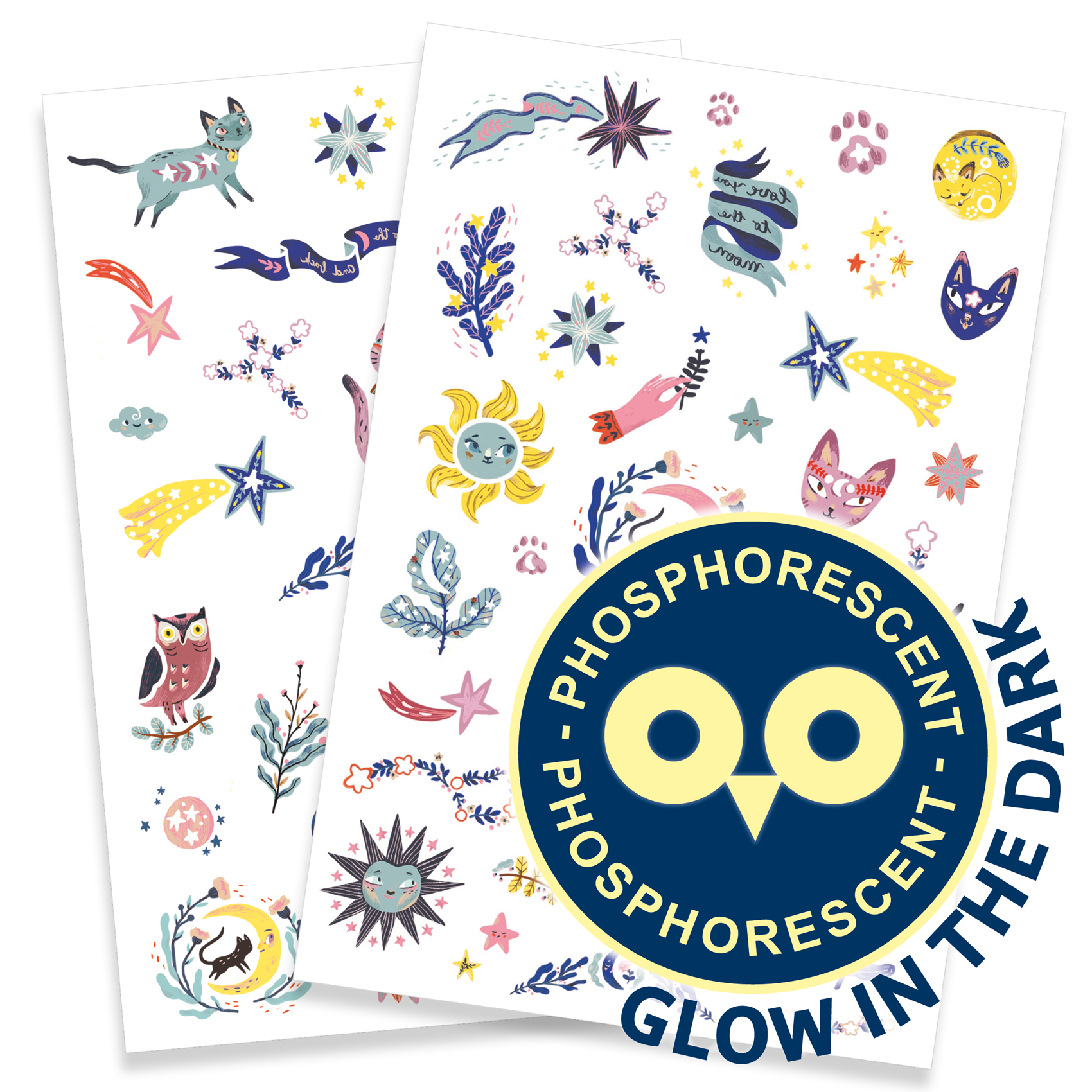 Два листа временных татуировок на ночную тематику с изображением всевозможных очаровательных животных. Детям особенно понравятся светящиеся сюрпризы и дополнительные детали, которые появляются в темноте! Эти временные татуировки предварительно вырезаны, чтобы их было удобно использовать, и переносятся с помощью небольшого количества воды. Протестировано дерматологами.