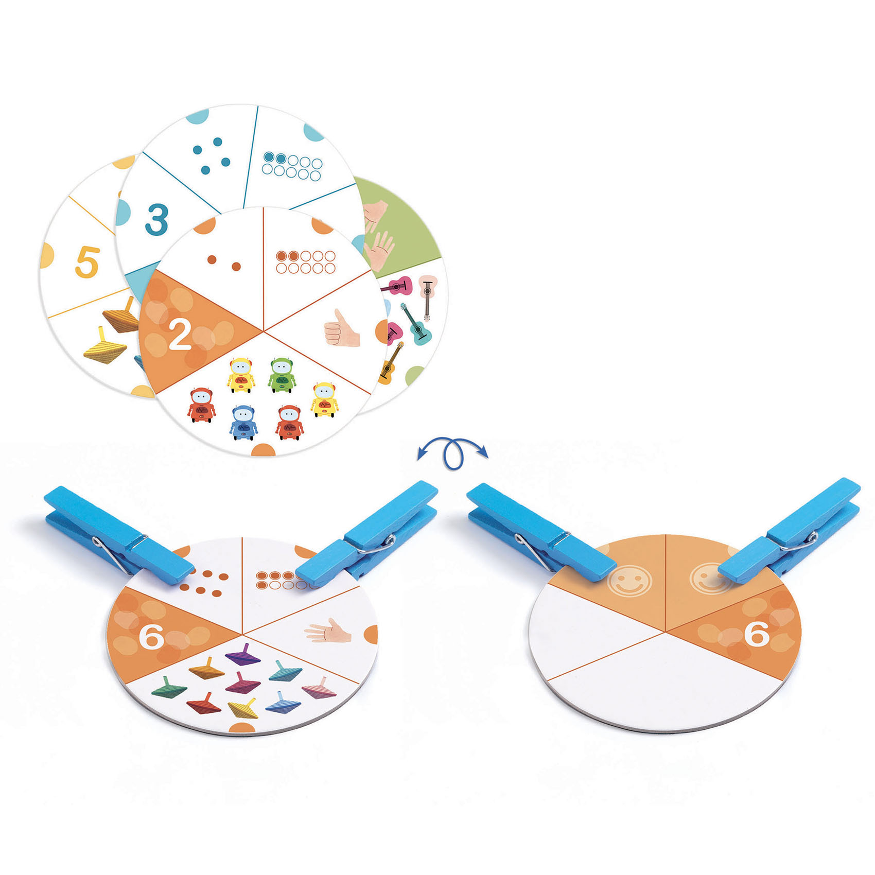 Настольная игра «Нумерикс» из серии Eduludo от французской компании Djeco - это прекрасный повод провести время со своим ребенком. В процессе занятия он изучает простым и интересным способом числа и учится считать разные предметы, а также у него развивается математический склад ума с самых ранних лет. Деревянными прищепками можно отмечать правильные ответы.