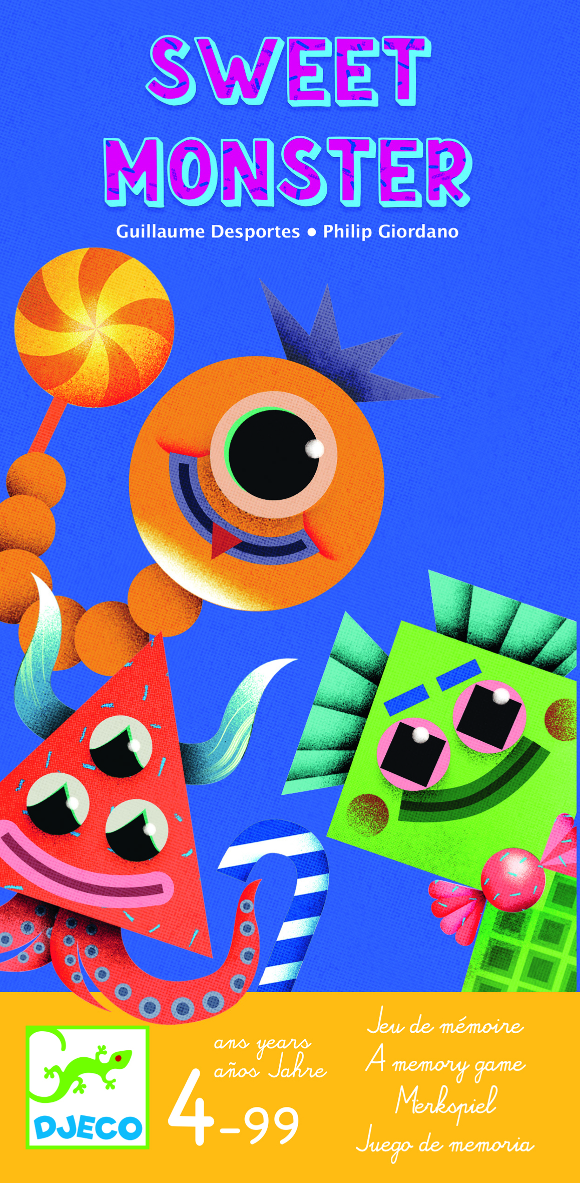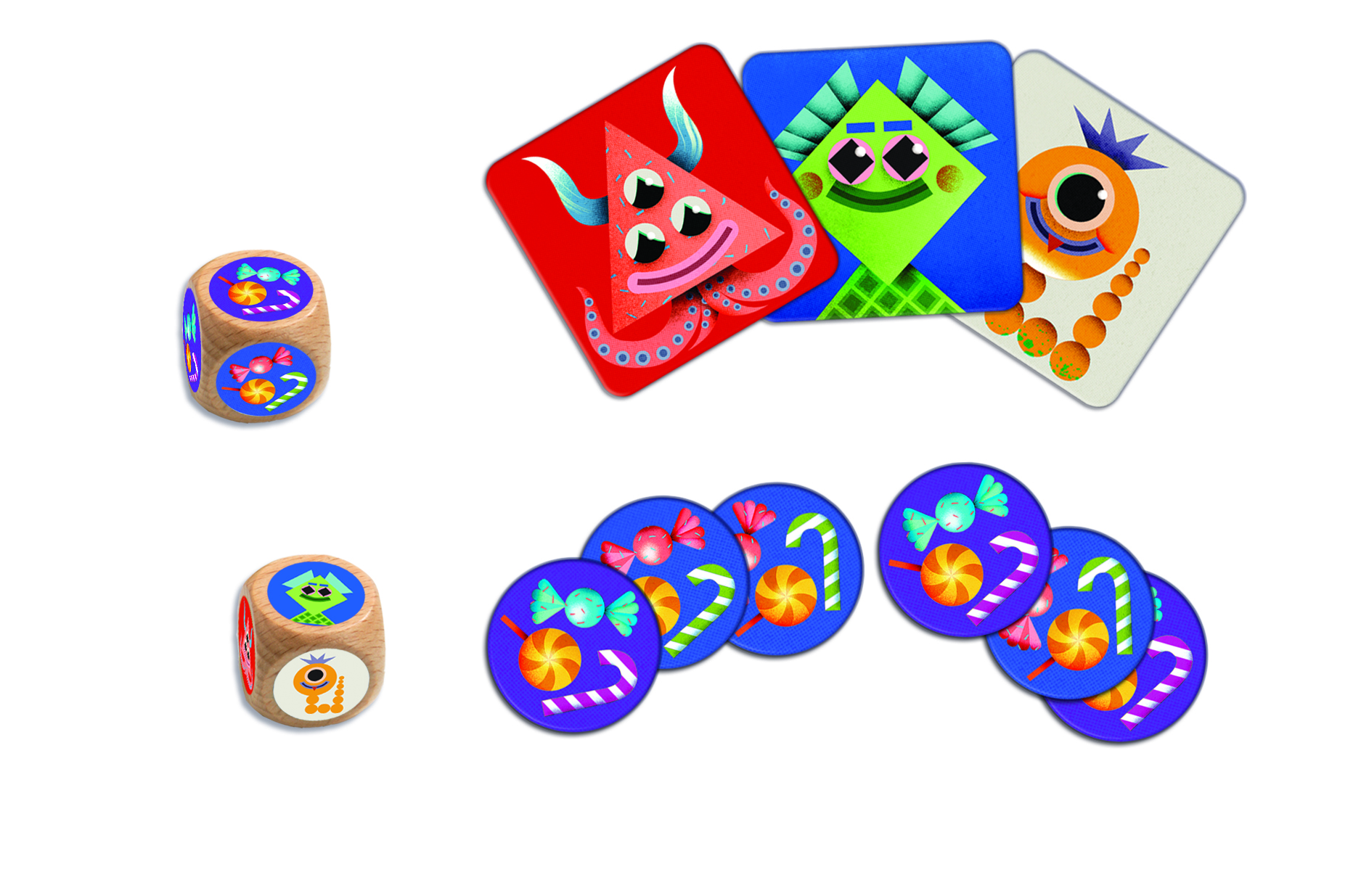 Игра на память с кубиками, в которой игроки должны угостить маленьких монстров, отыскивая их любимые сладости, используя свою память! Эта игра состоит из 12 различных двусторонних плиток (с монстром на одной стороне и сладкой или тухлой рыбой на другой). Когда подходит их очередь, каждый игрок бросает по 2 кубика, чтобы получить одного монстра и одну конфету. Затем они должны перевернуть фишку, на которой изображена эта комбинация, чтобы попытаться выиграть жетон. Осторожно: если игрок перевернет фишку, чтобы найти тухлую рыбу, он получит штраф! Первый игрок, у которого будет 5 жетонов, выигрывает игру.