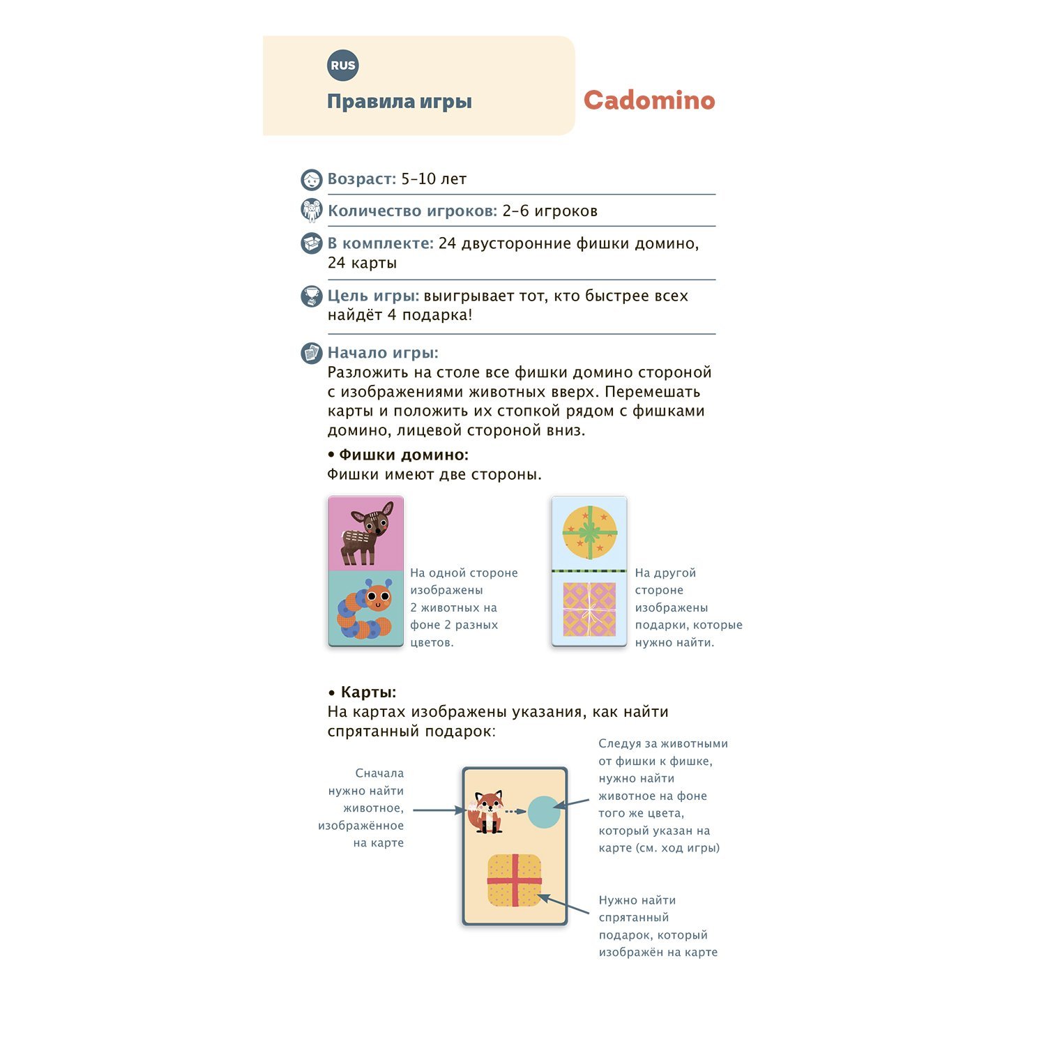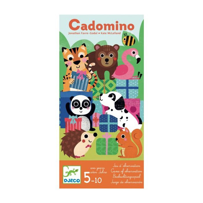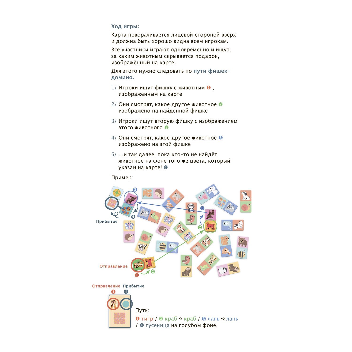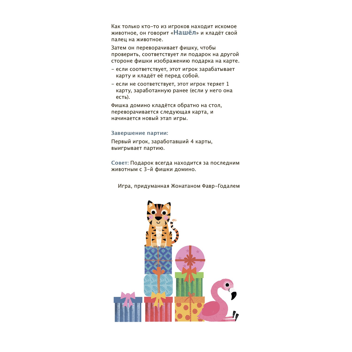 Игра на наблюдательность и скорость. Эти животные-обманщики прячут подарки! Кто найдет их быстрее всех? Для каждой перевернутой карточки-задания вы должны определить животное, которое является отправной точкой, и цвет, который представляет конечную точку. Каждый игрок перебирает в уме костяшки домино, чтобы первым найти квадрат, под которым спрятан подарок!