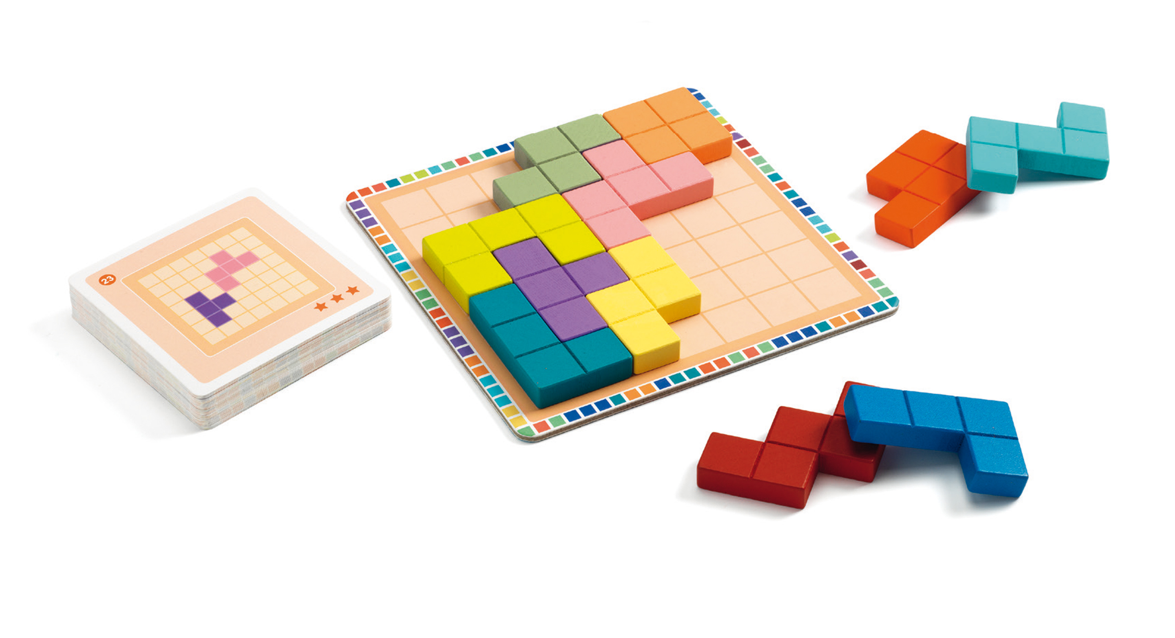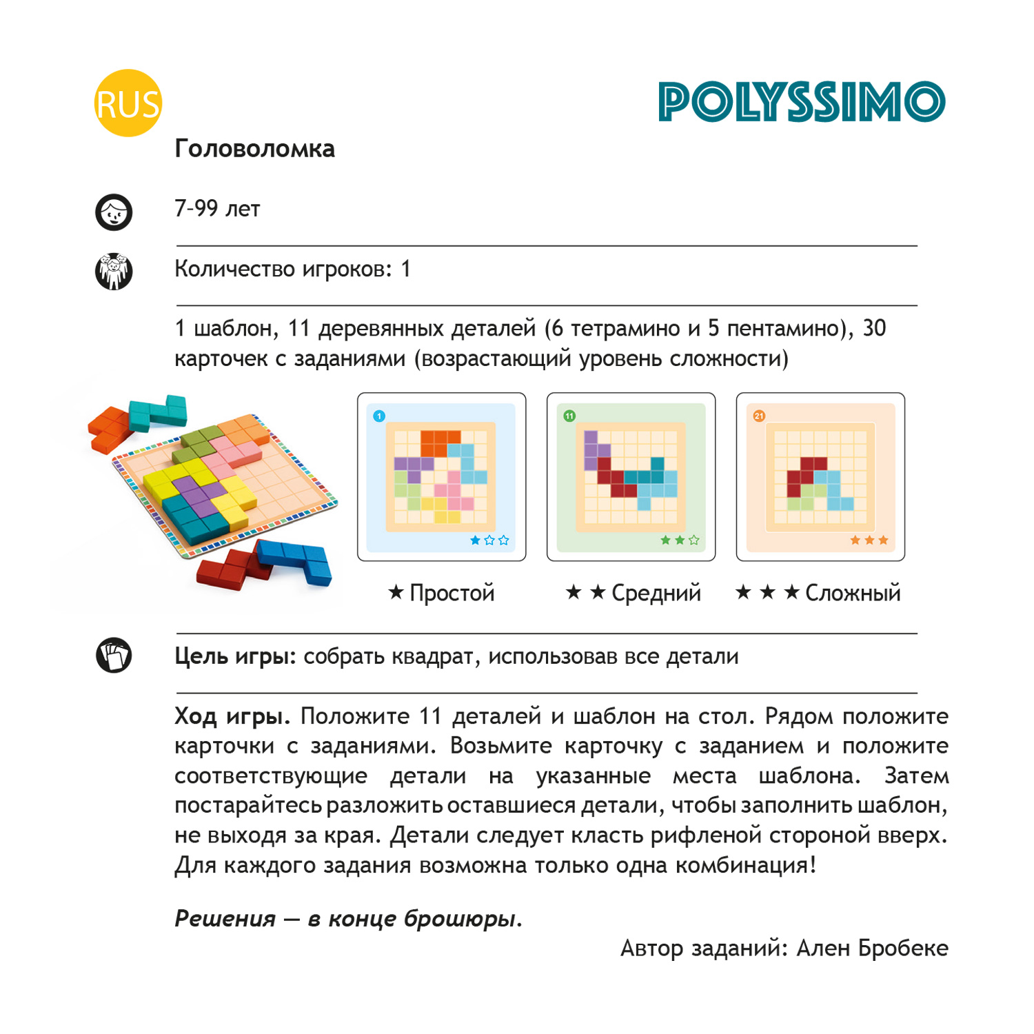 Логическая игра, в которой игроки должны собрать идеальный квадрат для каждого испытания, используя 11 деревянных деталей. Вам сообщается ваша начальная позиция, и только одна комбинация возможна для каждого испытания. Всего 30 испытаний с возрастающими уровнями сложности. Разогрейте свои мозговые клетки!
