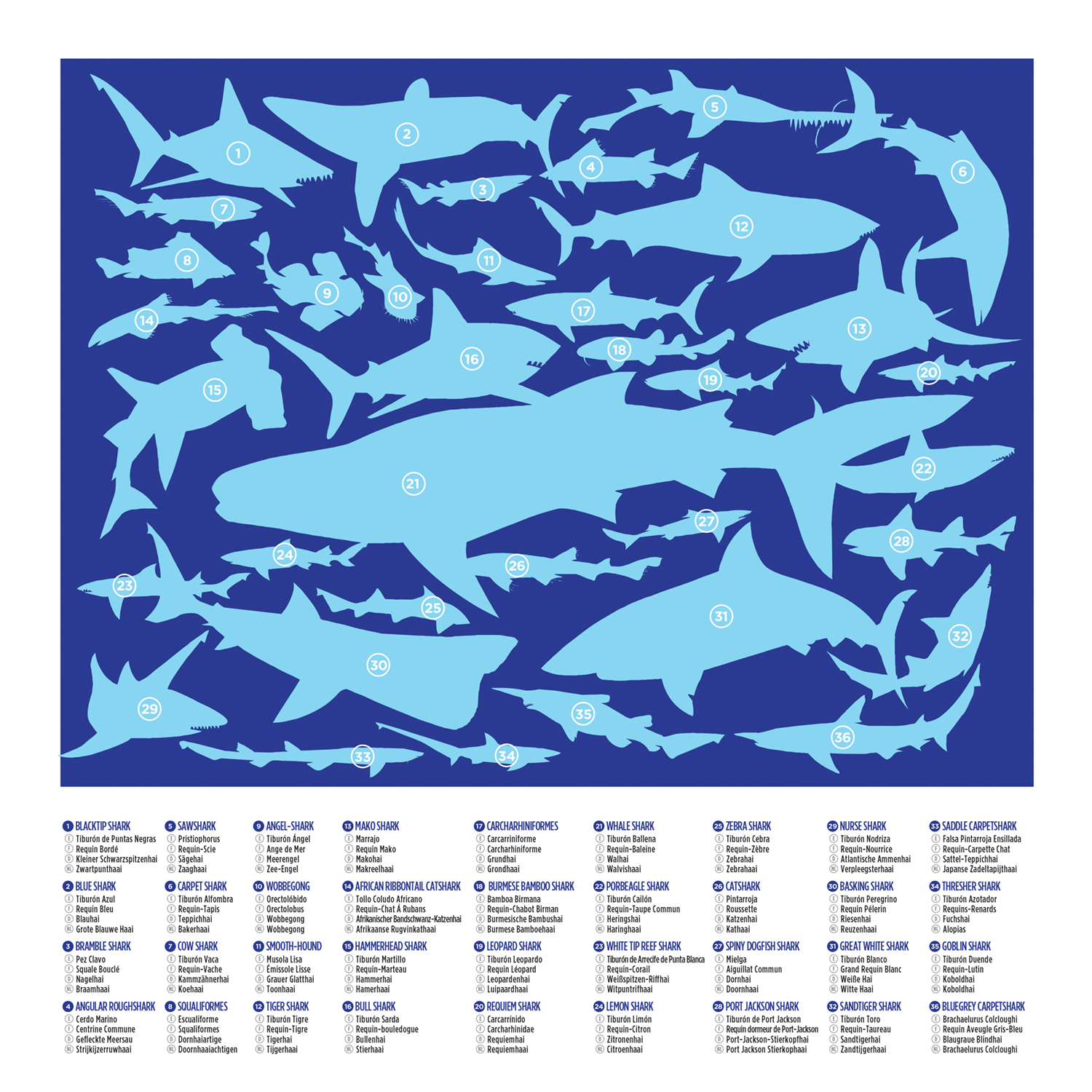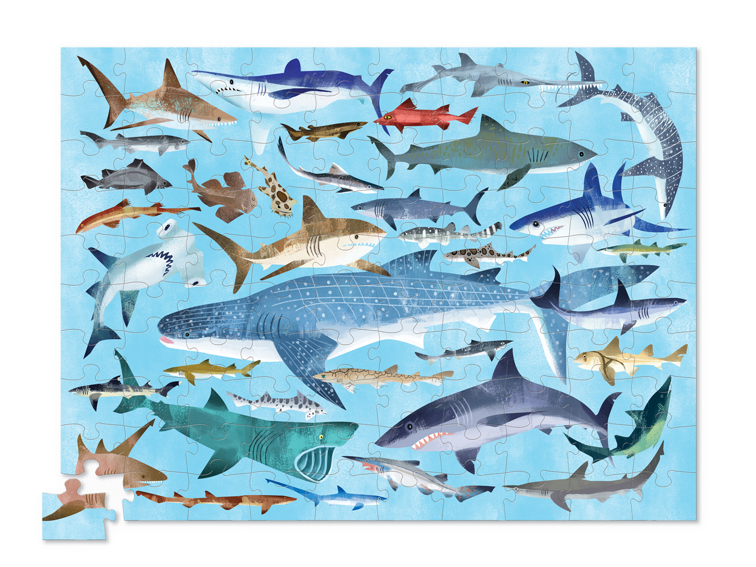 Этот напольный пазл из 100 деталей - сложная и увлекательная игра для детей, позволяющая изучать удивительный подводный мир акул. Головоломка рассказывает о 36-ти видах акул и включает в себя таблицу, в которой перечислены названия каждого  на нескольких языках.