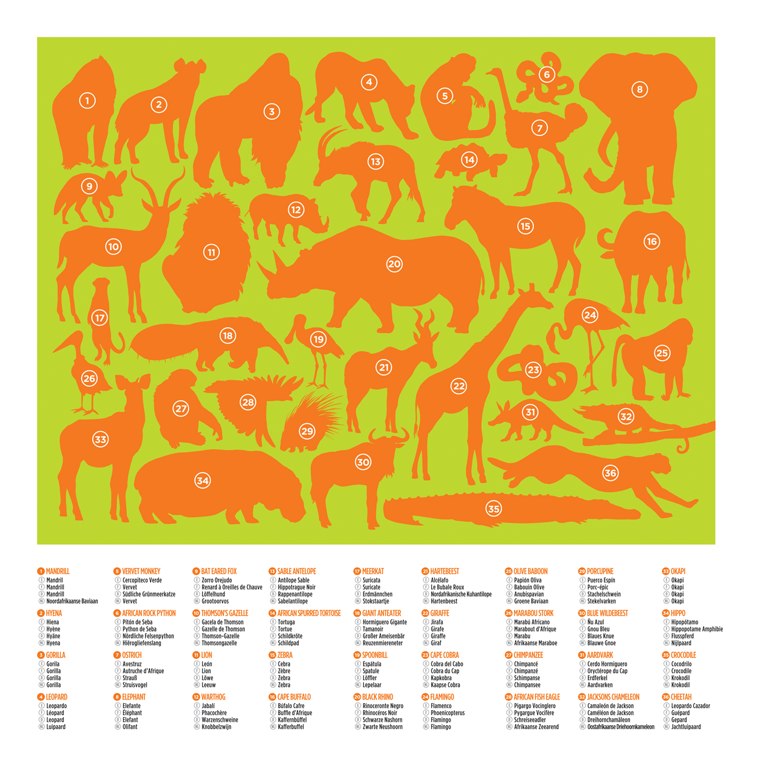 Пазл состоит из 100 деталей. Красочные элементы собираются в цельную иллюстрацию с изображением 36-ти животных, которых интересно рассматривать и изучать. Головоломка упакована в яркий тубус, что делает ее отличным вариантом подарка. В комплекте идет буклет с названиями зверей с иллюстрации.