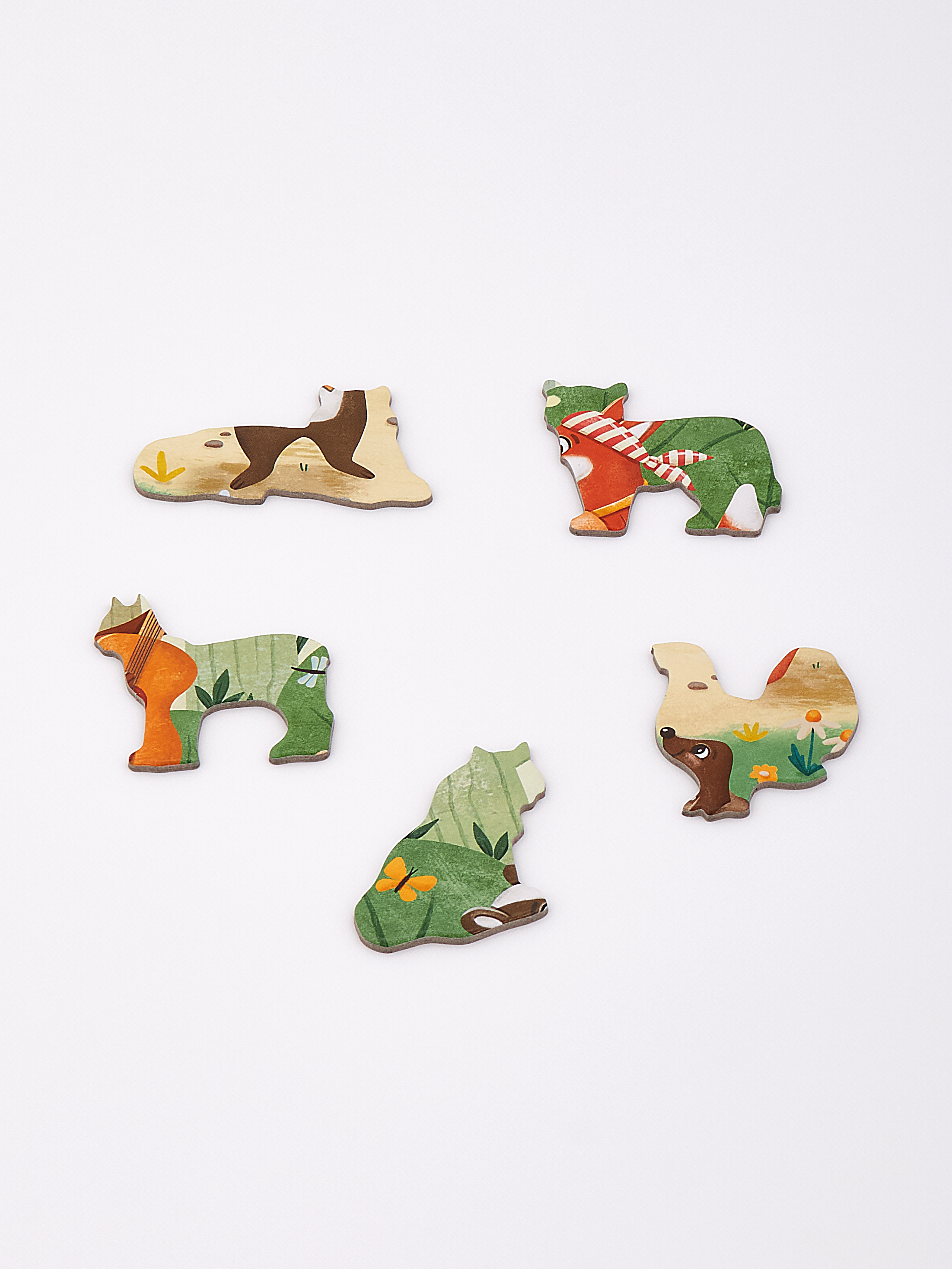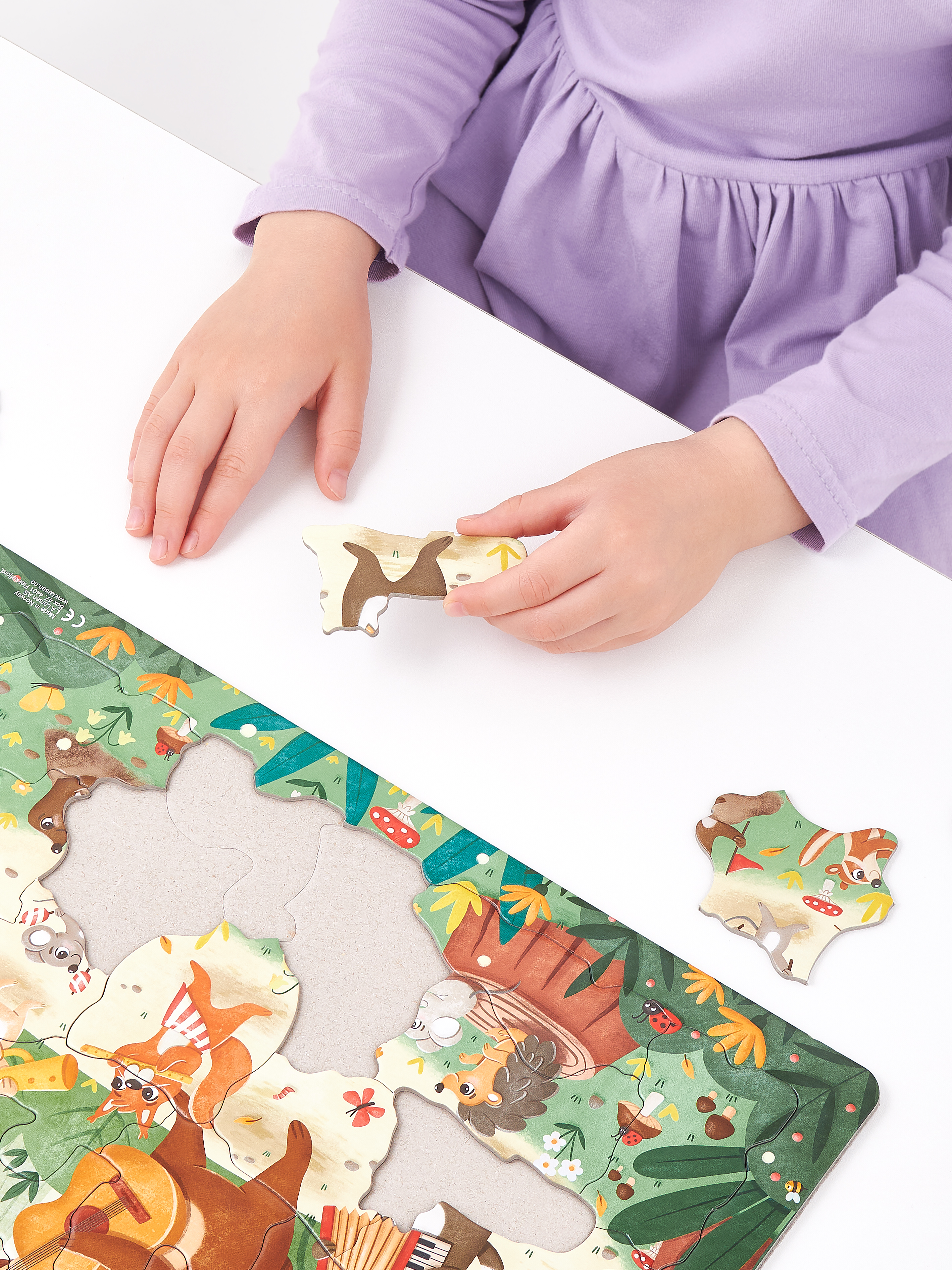 Музыкальная группа: барсук с гормошкой, медвежонок с гитарой, заяц с дудкой, белочка со флейтой и лиса с барабаном. Им апплодируют и подпевают зрители: сова, белочки, бобр, крот, ёж и мышата. Пазл понравится малышам от четырех лет.