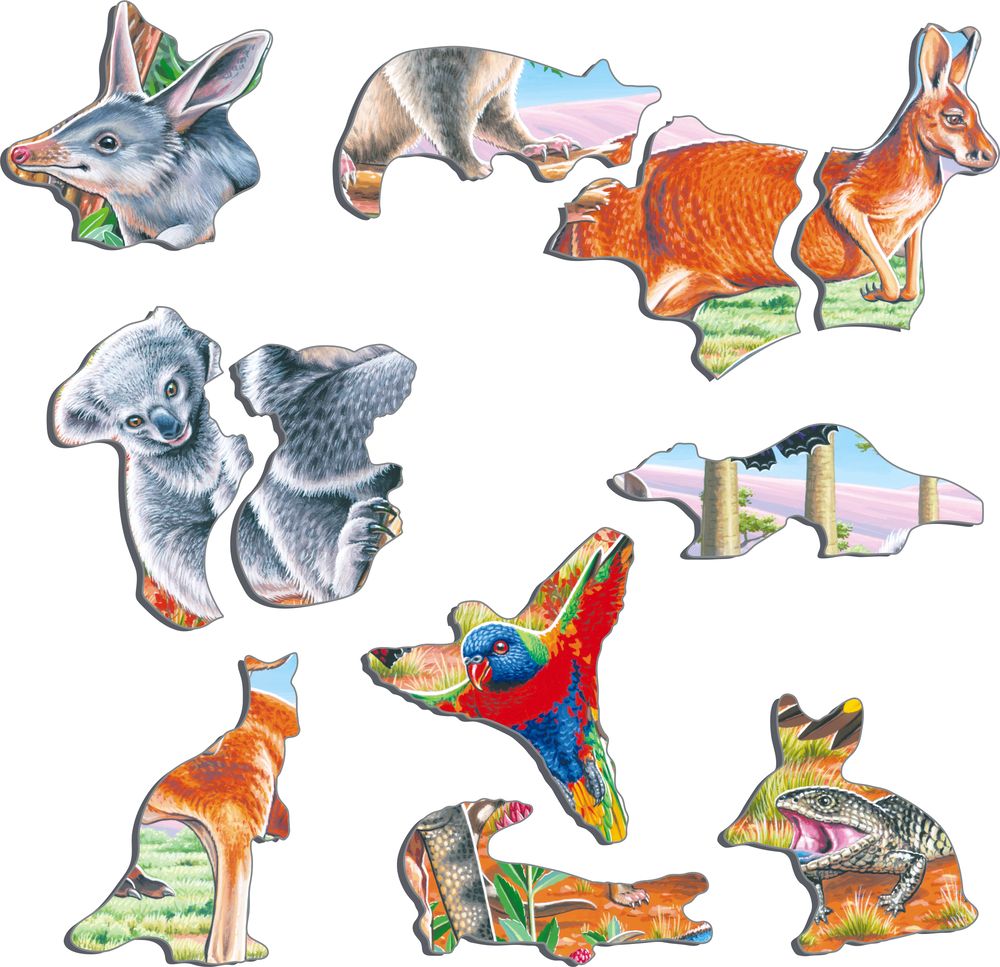 Животный мир Австралии разнообразен и во многом уникален. Причиной этому стали длительная географическая изоляция Австралии от остального мира и богатые климатические условия. Многие животные этого материка являются эндемиками (вид животных, обитающих только на конкретной территории). На собранном пазле представлены : Кузу, паук Австралийская вдова, Красная Кружевная бабочка, Златобокий фиговый попугайчик, Коала, Эму, Королевский попугай, Кроличий бандикут, Ехидна, Намбат (сумчатый муравьед), Короткохвостый сцинк, Паук-павлин, Пятнистохвостая сумчатая куница, Австралийский узкорылый крокодил, Лиловошапочный расписной малюр, Плащеносная ящерица, Пёстрый варан, Кукабара, собака Динго, бабочка Ласточкин хвост, Радужный лорикет, Казуары, Красная розелла, Кенгуру и разнообразные растения Австралии. Различные формы и размеры отдельных элементов пазла способствуют развитию мелкой моторики у малышей. Сделанные из высококачественного трехслойного картона, они не деформируются и легко берутся в руки. Игра развивает